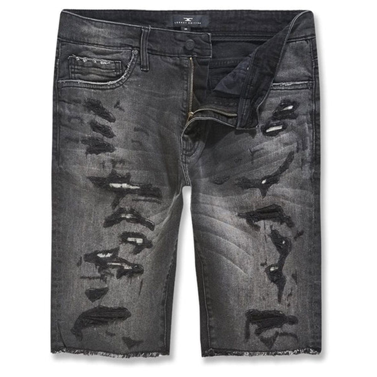 These regular rise, Black Shadow denim shorts from Jordan Craig feature heavy shredding details, an 11.75" inseam for the OG look falling at knee, raw and reversed denim backing, crinkle effect, and closed inseam at knees.
