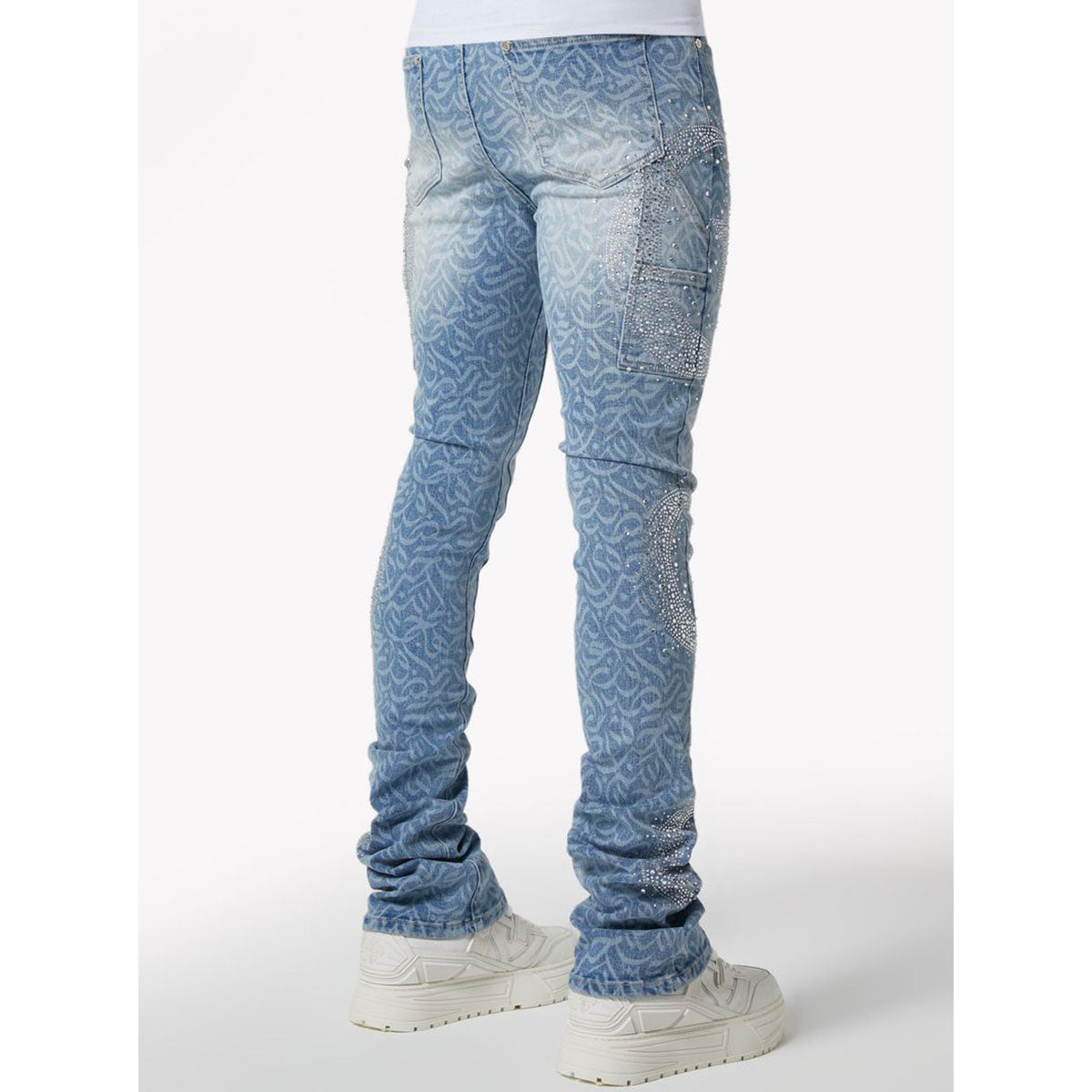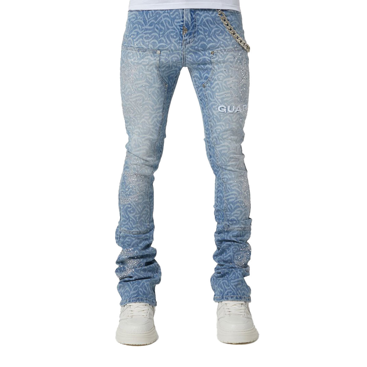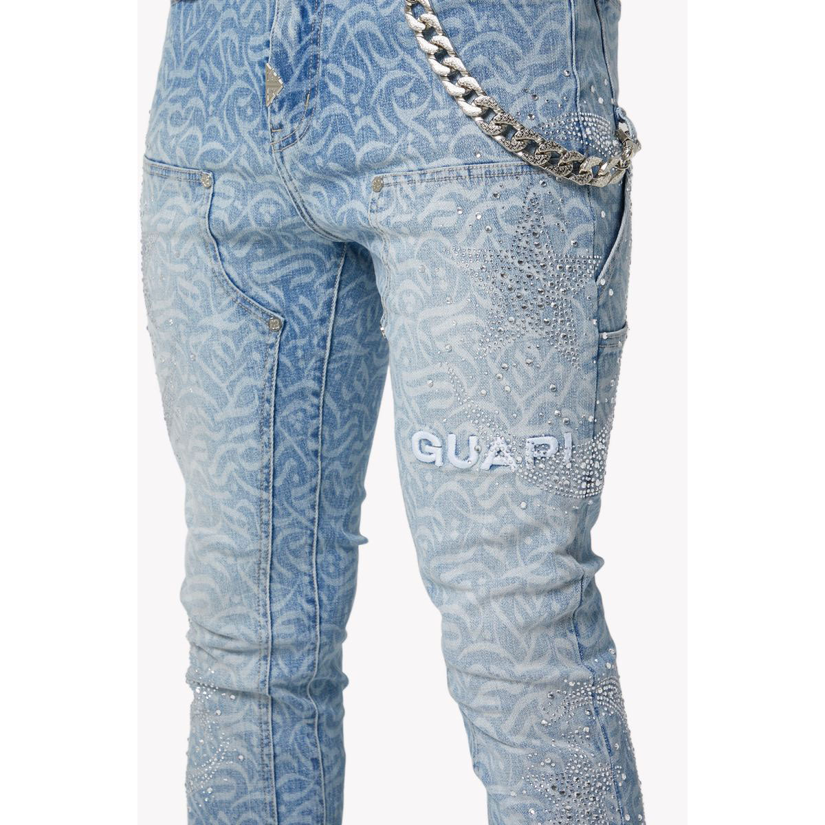 These regular rise, aqua blue jeans from GUAPI feature an all-over abstract calligraphy pattern in a gradient blue wash, hand-applied crystal embellishments, 3D embroidered branding, silver-tone rivets, and chain accessory on waistband.