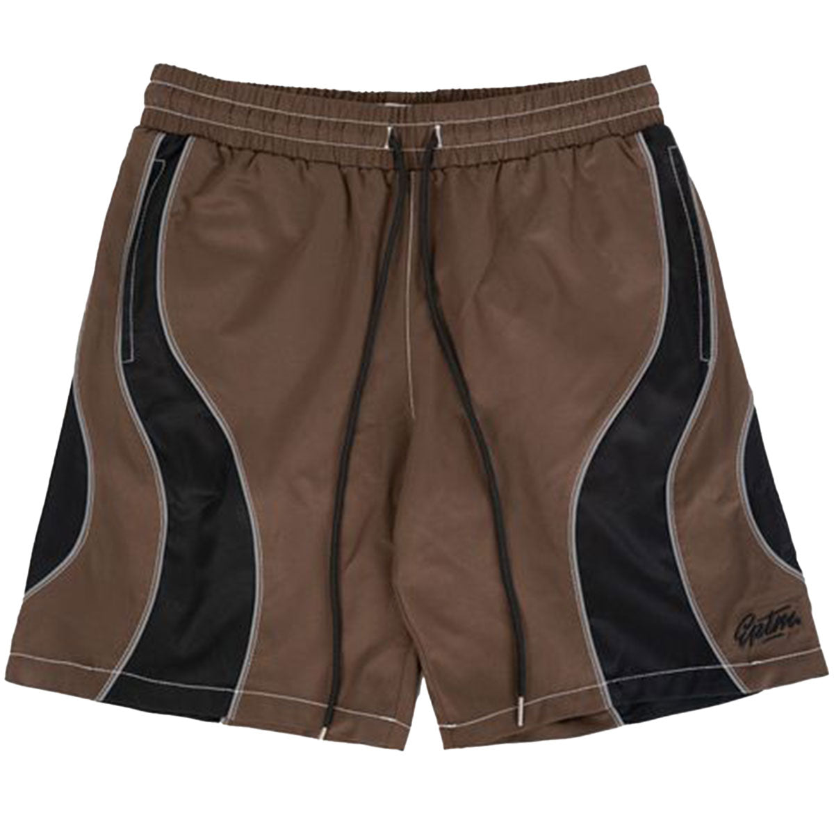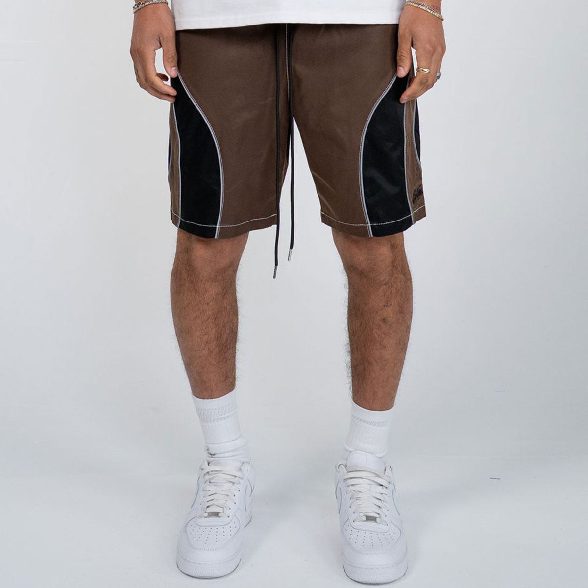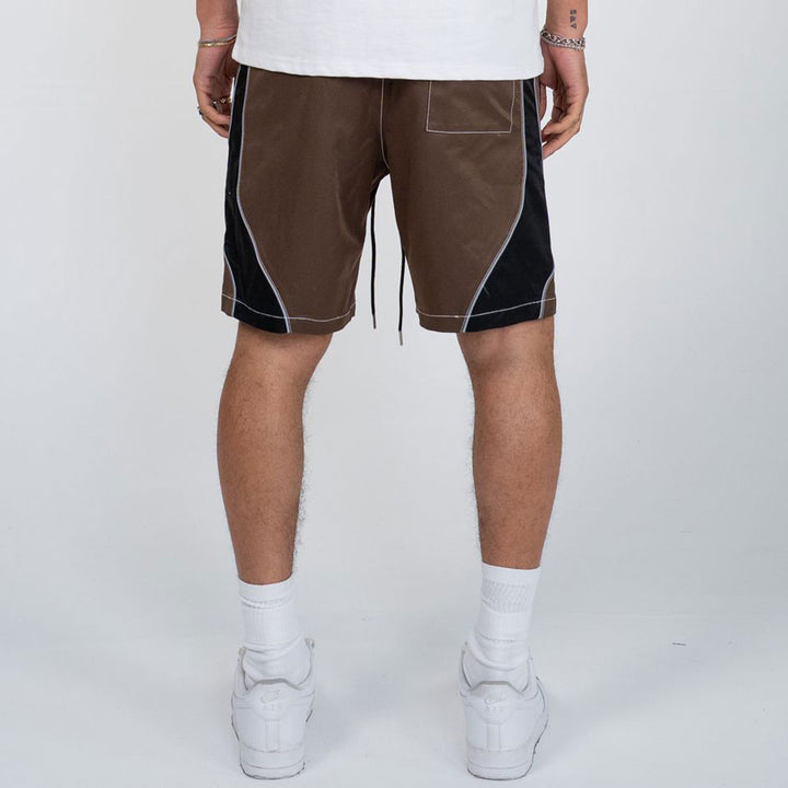 These brown shorts from EPTM feature a color block design with 3M reflective piping, side seam pockets, back pocket, and an elastic waistband.