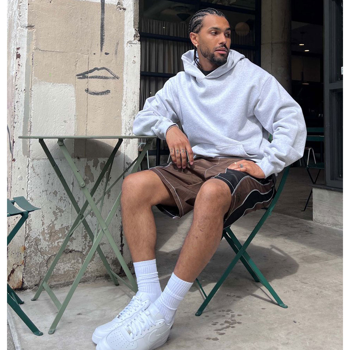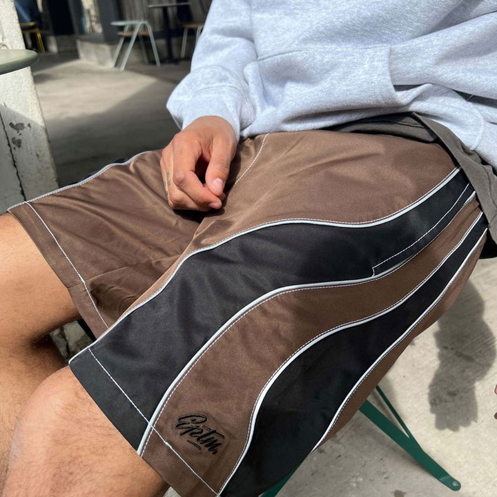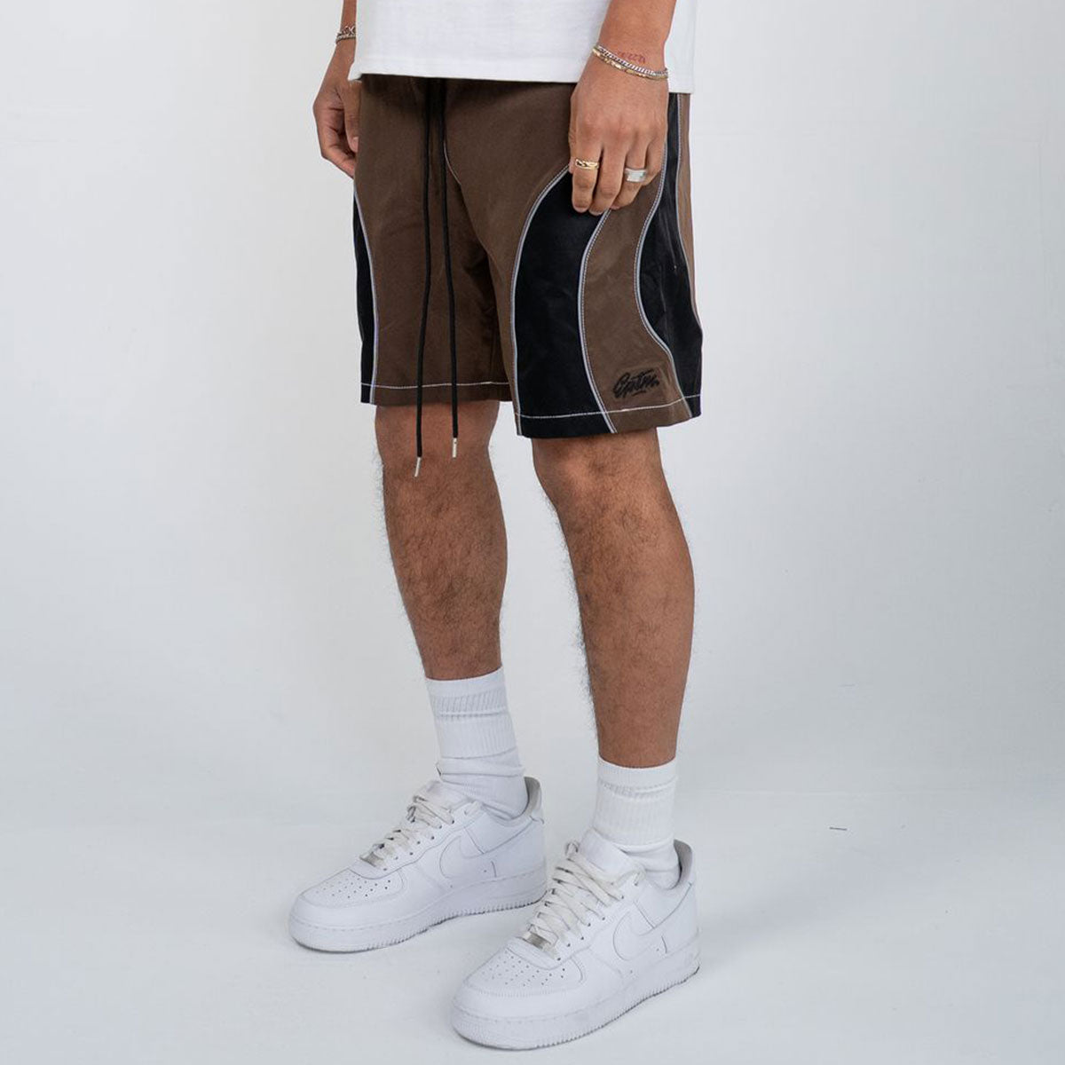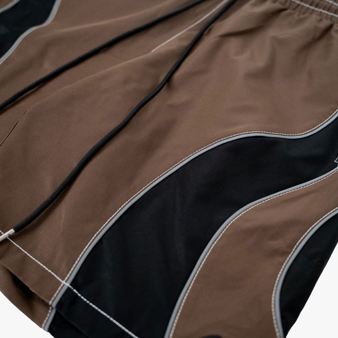 These brown shorts from EPTM feature a color block design with 3M reflective piping, side seam pockets, back pocket, and an elastic waistband.