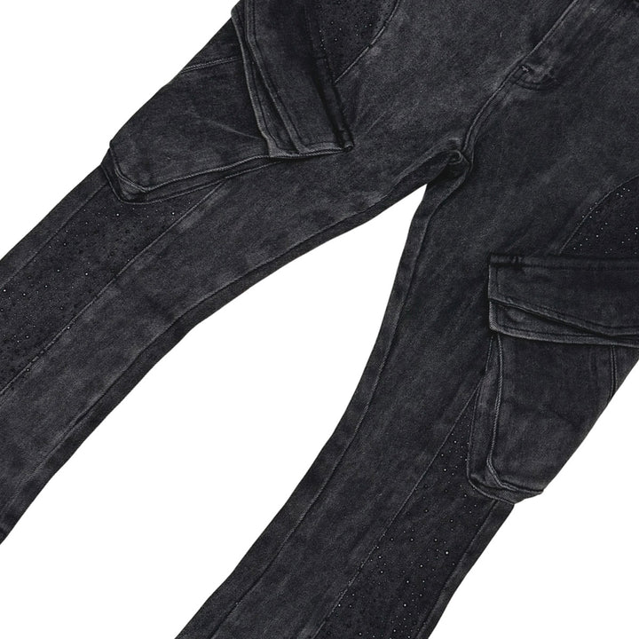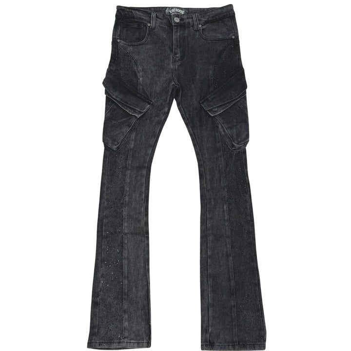 These regular rise black denim pants jeans from Vicious feature side cargo pockets, a stacked flared look, and small black rhinestone details throughout leg.