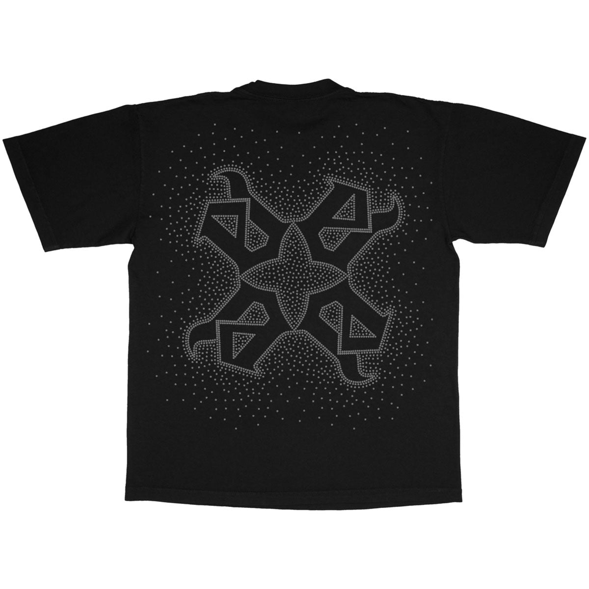 This black t-shirt from Evil Vice features a front repeat rhinestone logo graphic on front and a matching large rhinestone logo graphic on rear.