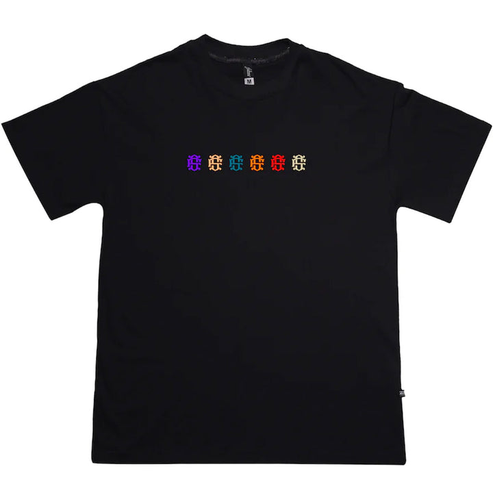 This black t-shirt from FSHNS Brand features a repeat multicolored monogram print on front and a matching large repeat monogram print on rear with a small silicon logo patch.