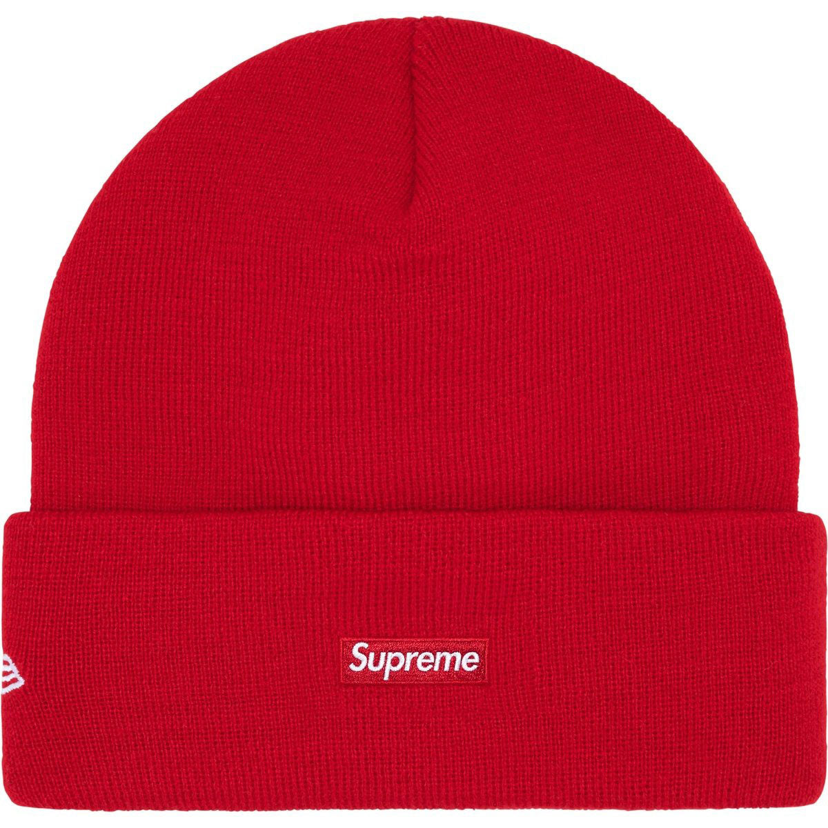 This red beanie from Supreme in collaboration with New Era® features a pink embroidered Old English logo on front and the signature box logo on rear. From the FW25 Collection