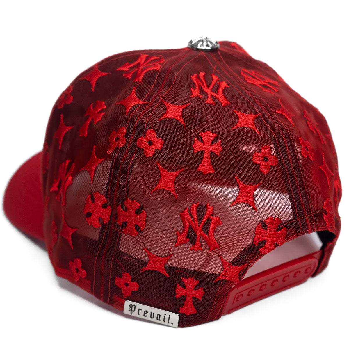 This red hat from Prevail Brand features a premium custom NY monogram mesh embroidery, a pink underbrim, and fully custom details.
