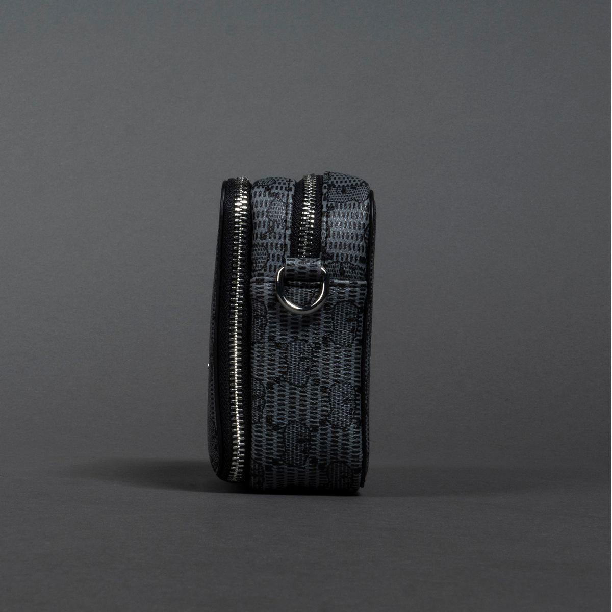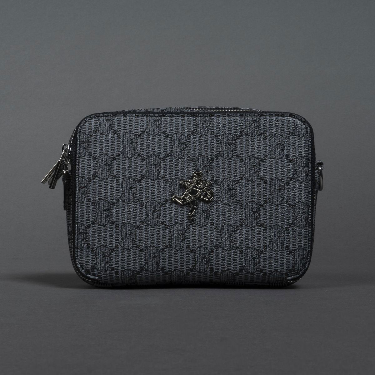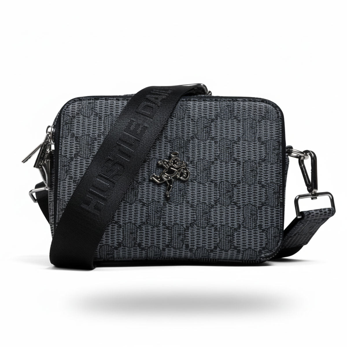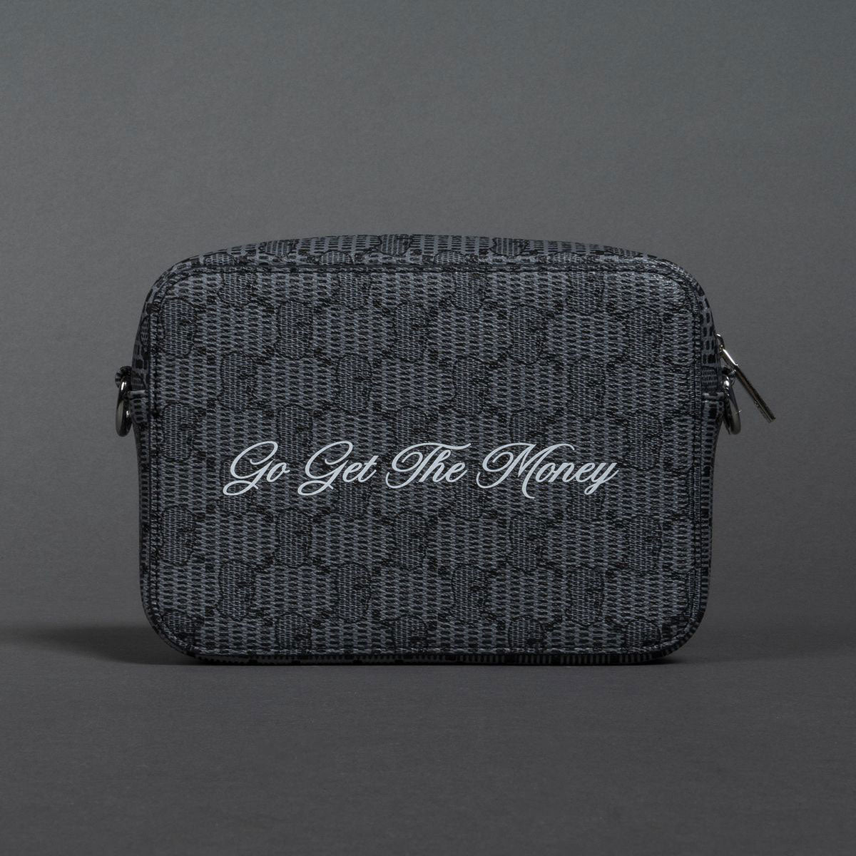 This black and grey crossbody bag from Hasta Muerte features a repeat ski mask pattern on front, a 'go Get the Money' slogan on rear, and multiple divisions.