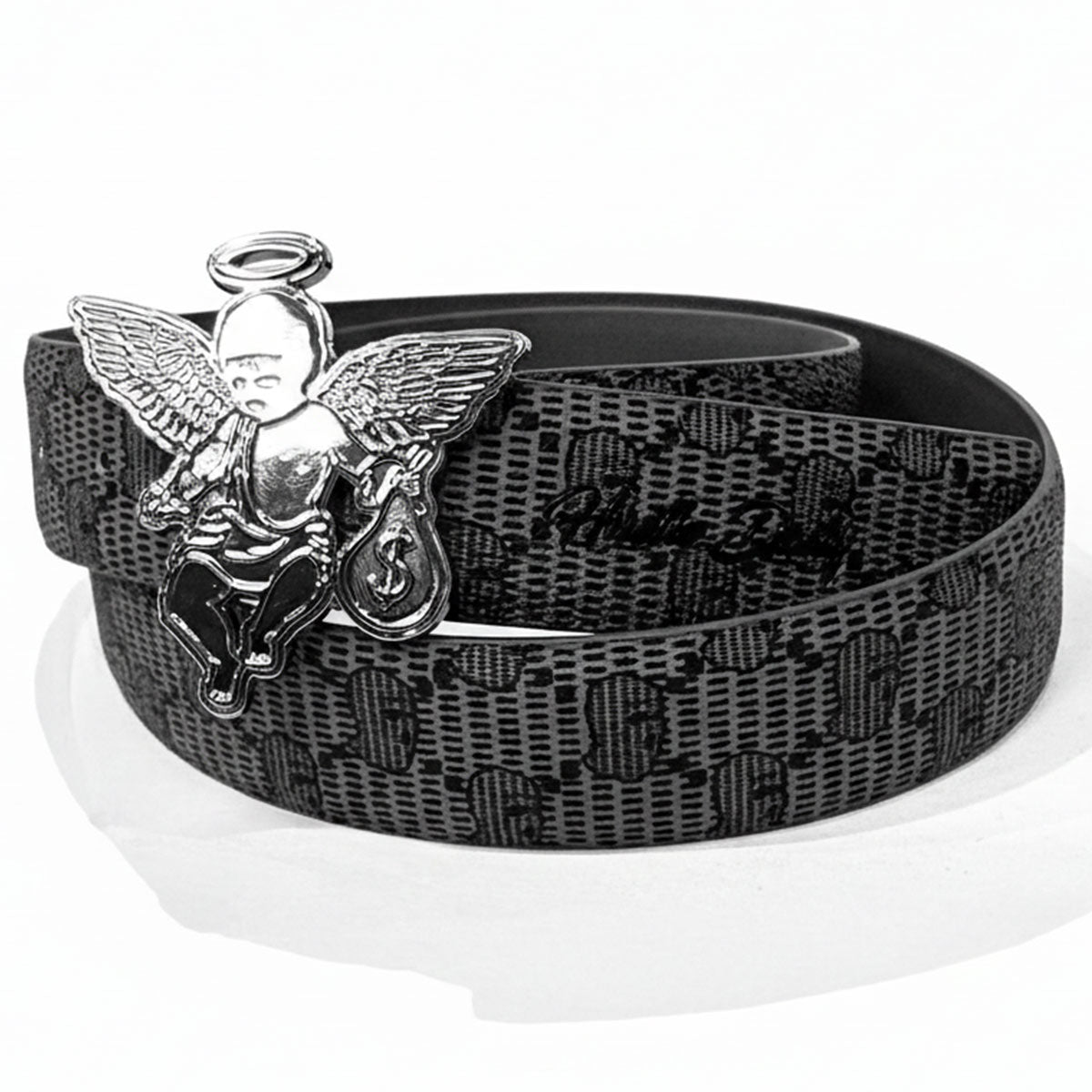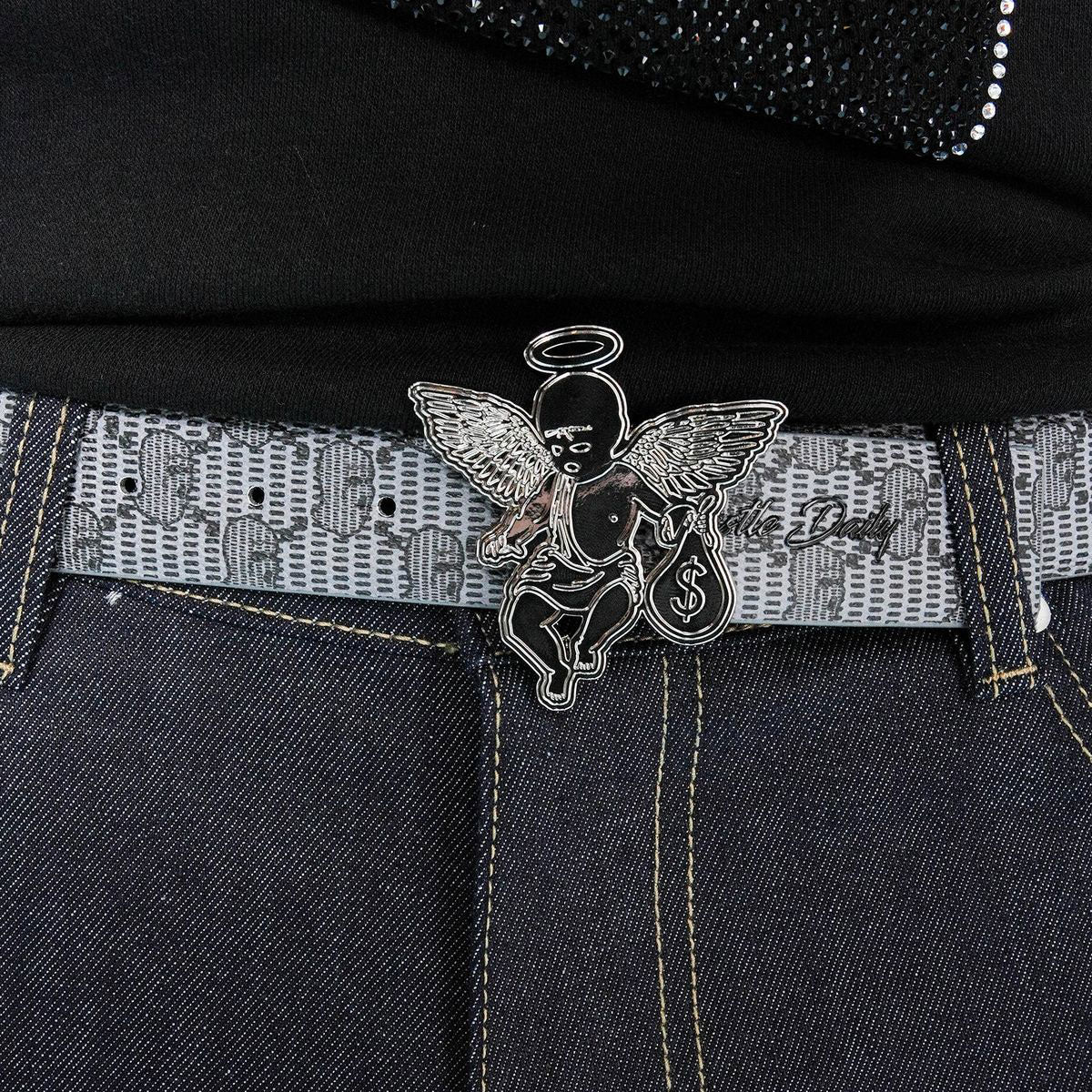 This grey and black belt from Hasta Muerte features the signature ski mask angel pattern and the angel metallic buckle.