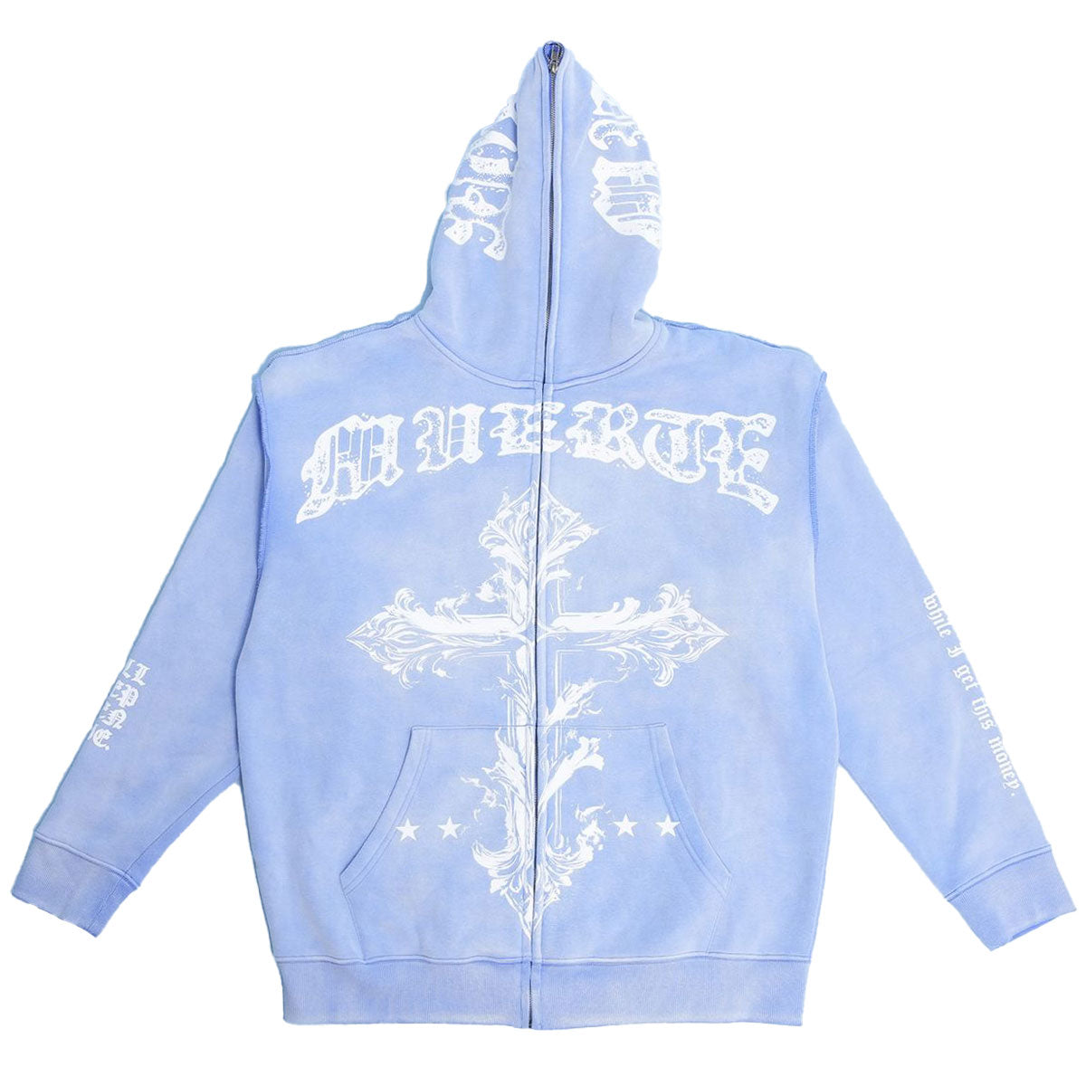 This light blue potassium hoodie from Hasta Muerte features a large cross graphic with branding on front, a full zip up design, sleeve graphics, kangaroo poockets, and a large Jesus graphic with a 'God Bless the Real' slogan on rear.