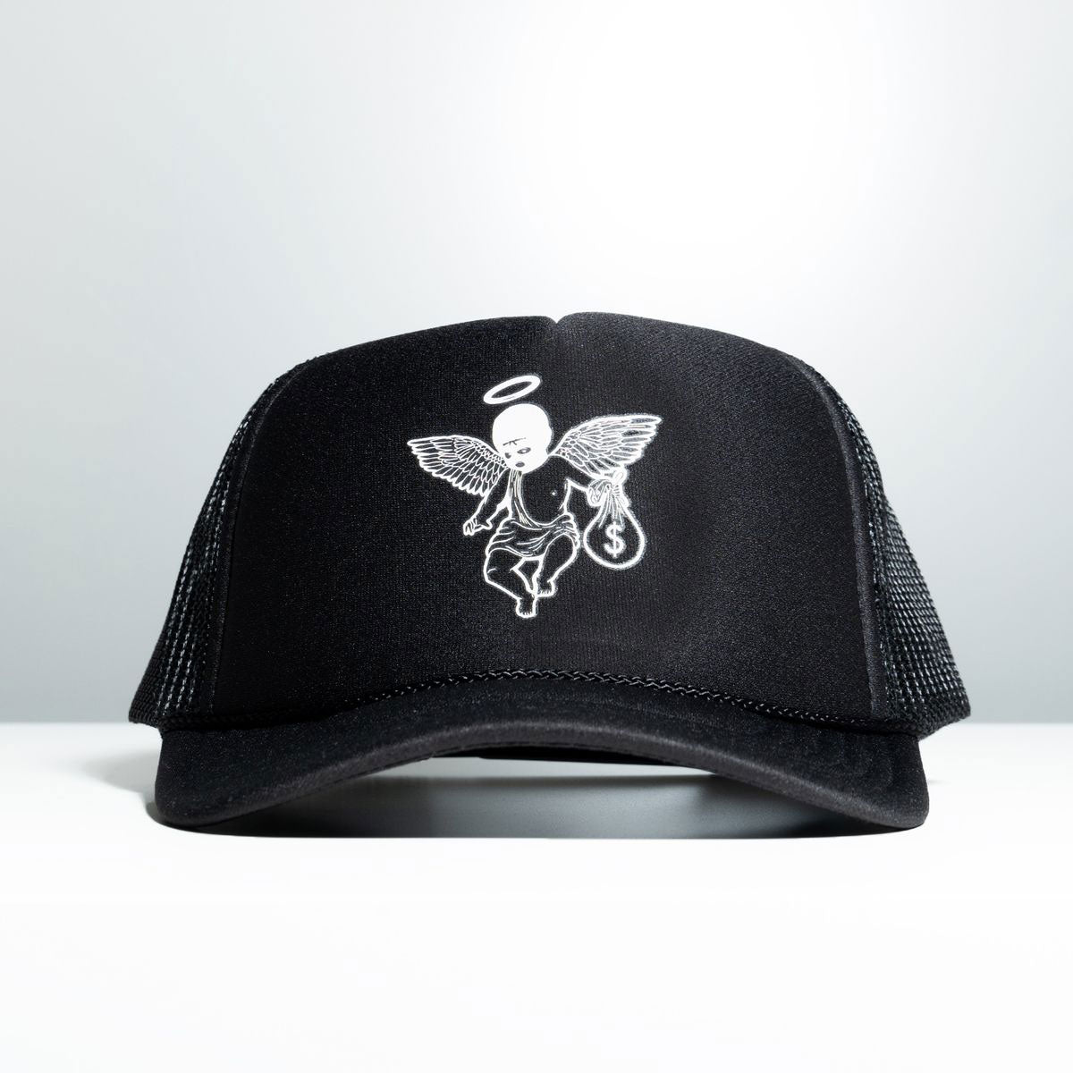 This black trucker hat from Hasta Muerte features the signature ski mask money bag angel graphic on front and a foam construction.