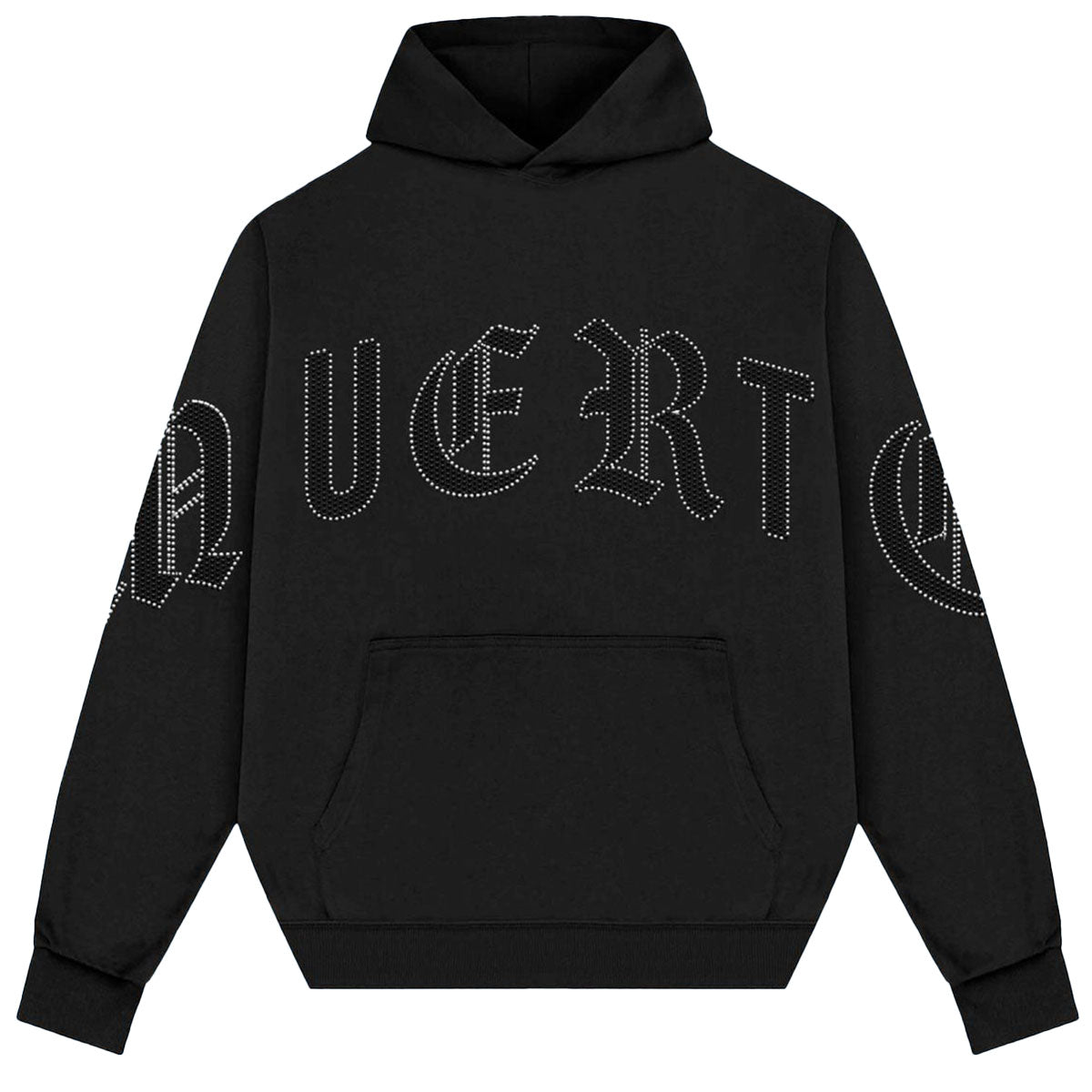 This black hoodie from Hasta Muerte features a large black branded graphic with rhinestones on front and a 3D bone structure detail on rear.