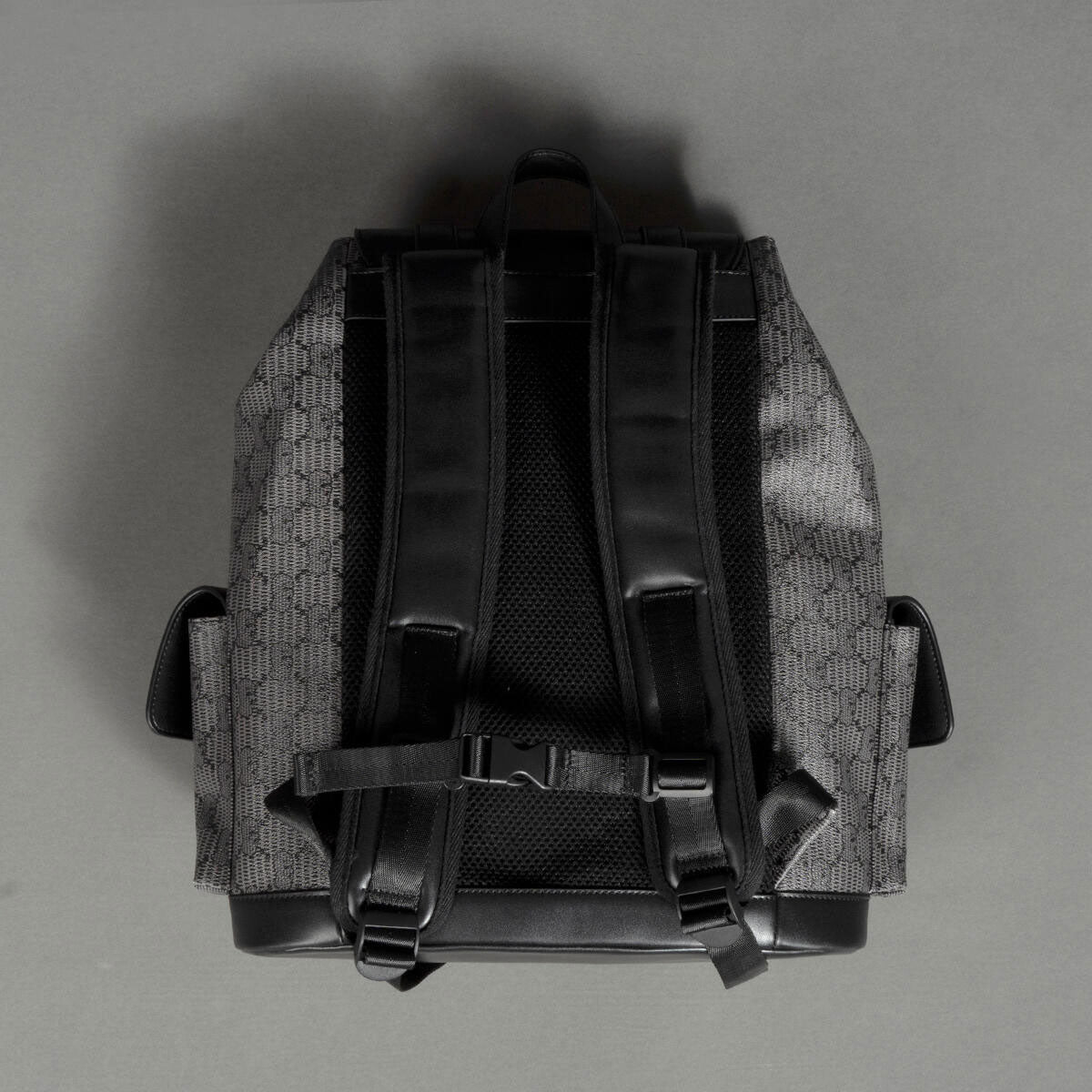 This black backpack from Hast aMuerte features an all-over ski mask pattern, side pockets, interior divisions, and adjustable shoulder straps.