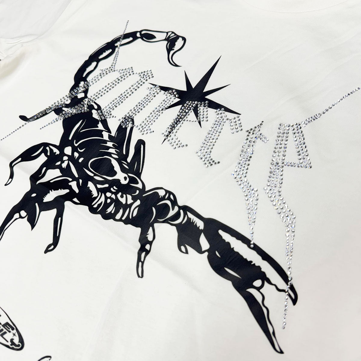 This natural cream white t-shirt from Hasta Muerte features a large scorpion graphic with rhinestone details and branded country club graphics on front.