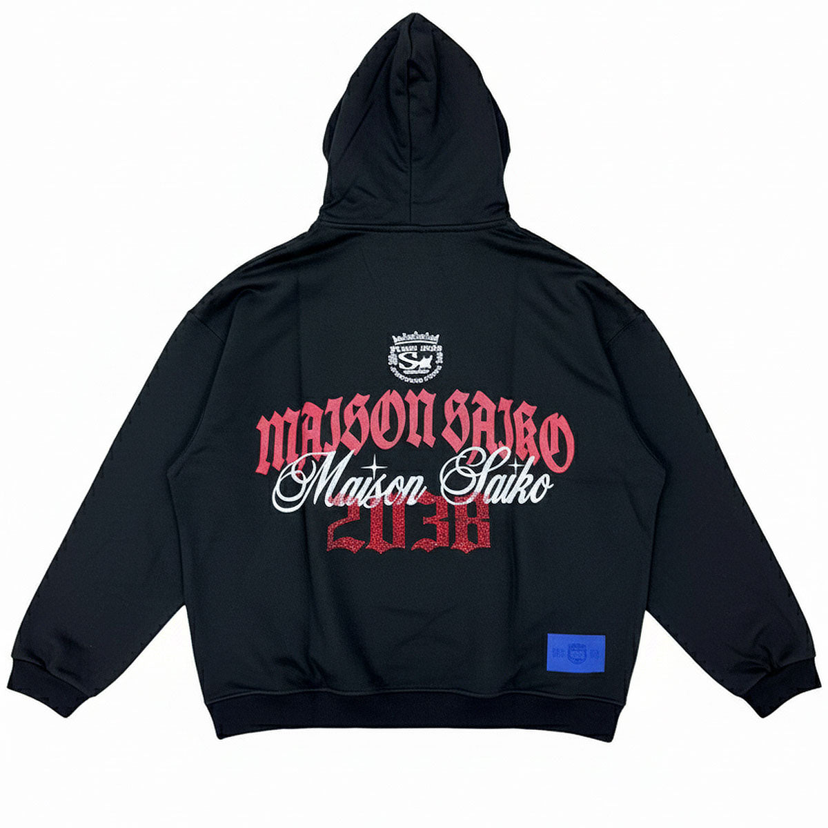 This black hoodie from Maison Saiko features a large galactic woman astronaut graphic with rhinestone branded details on front and a large matching branded graphic with rhinestones on rear.