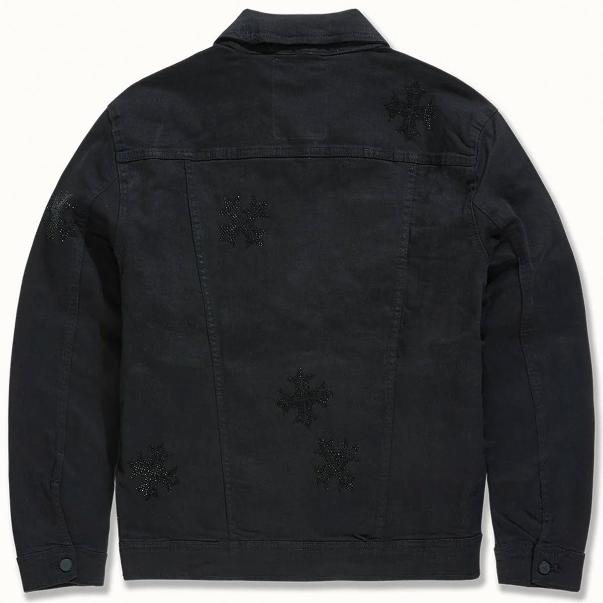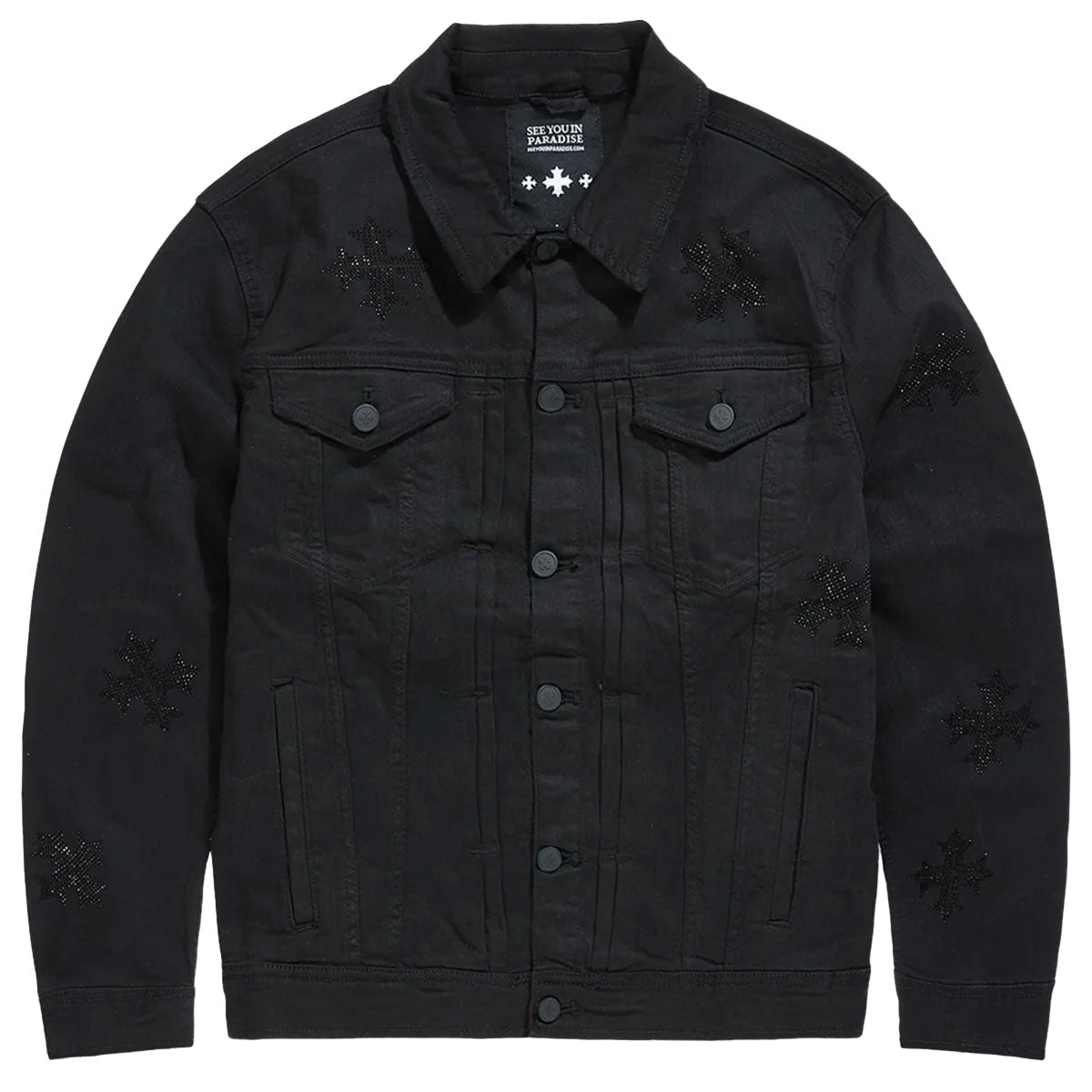 This jet black trucker jacket from See You in Paradise features a vintage look with rhinestone details throughout, 3D baked whiskers, unique distressing, pleated front, and a comfort stretch fit.