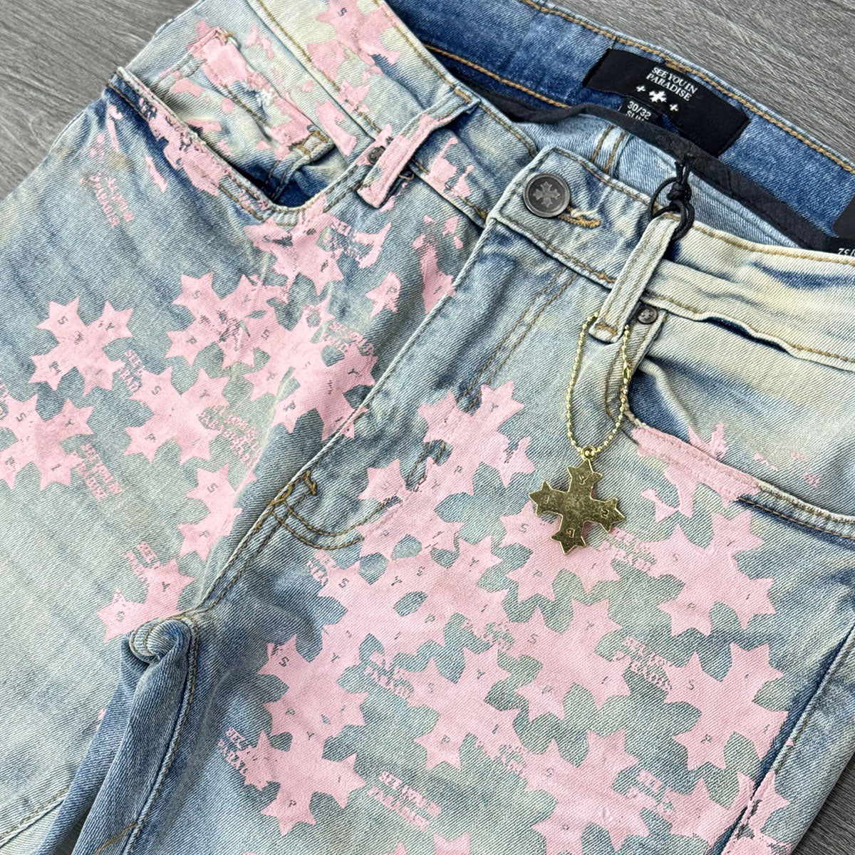 These regular rise, iced lager jeans from Jordan Craig feature tight tapering from knee to ankle, looser fit from waist to thigh, a custom metal hang-tag, an all-over 'See You in Paradise' stamp print, rip & repair design with fused shreds, and unique distresses.