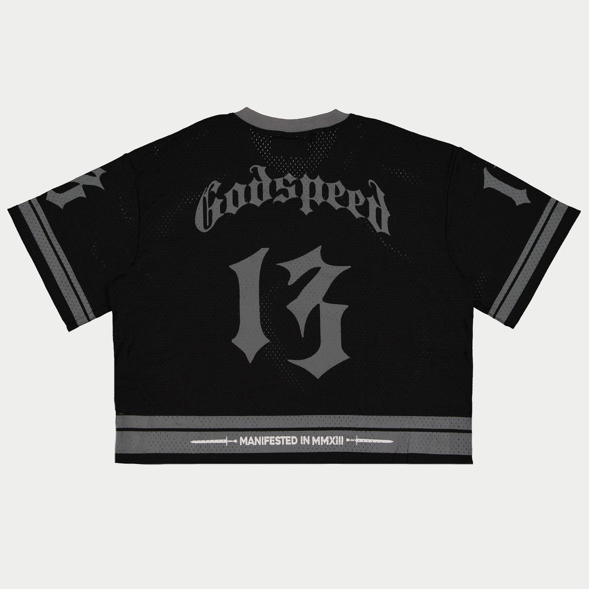 This black jersey from Godspeed features a large skull helmet graphic on front with contrasting grey stripes and a rear branded number logo.