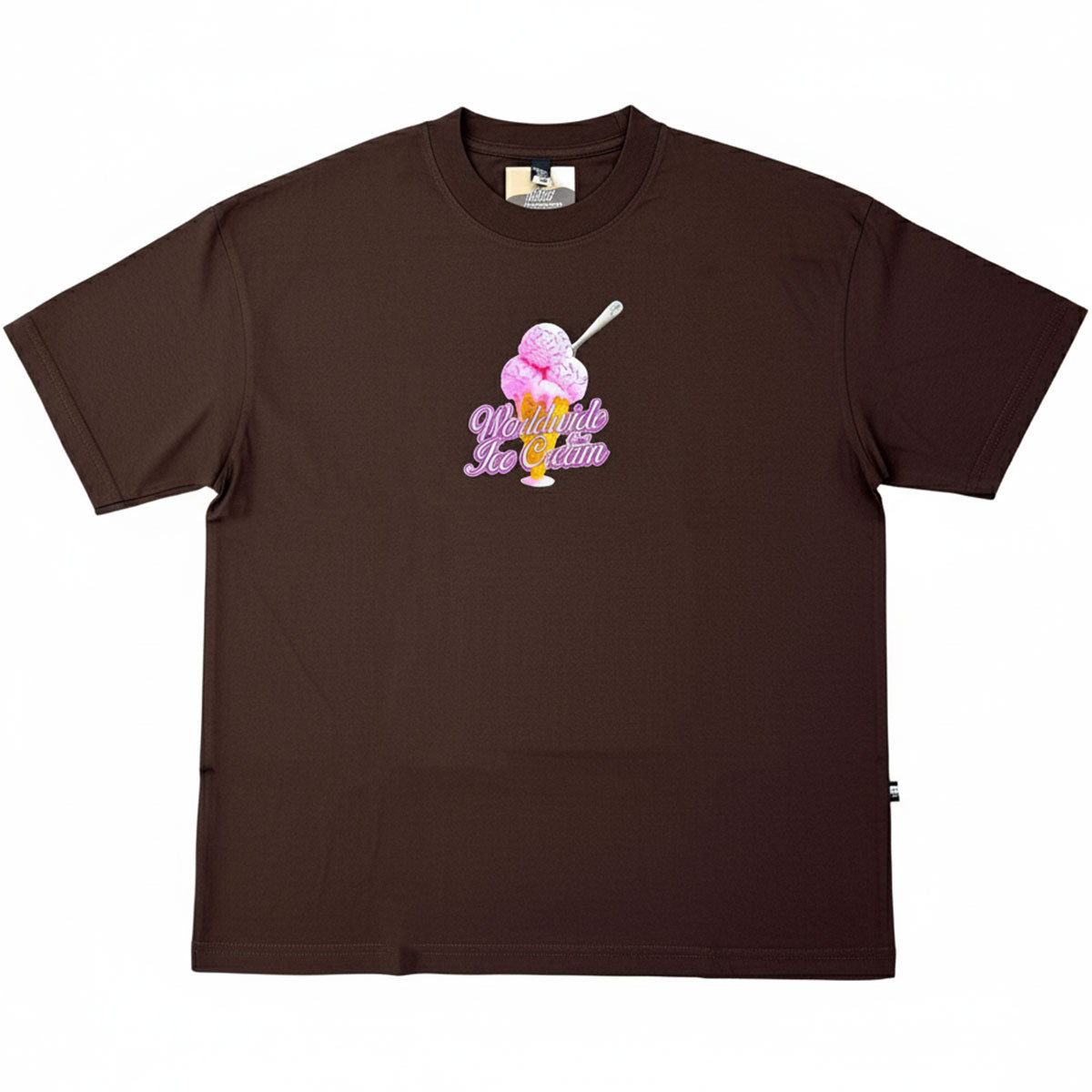 This brown t-shirt from FSHNS Brand features a pink ice cream cone graphic with branding and slogan on front and a matching large graphic on rear.
