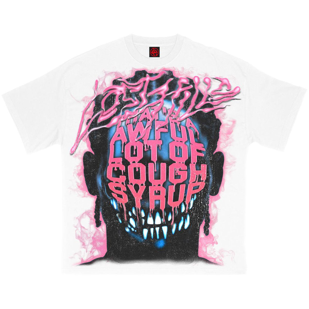 This white t-shirt made in collaboration by LOSTHILLS and That's a Awful Lot of Cough Syrup features a pink dripping skull graphic with branding on front and a matching graphic on rear.