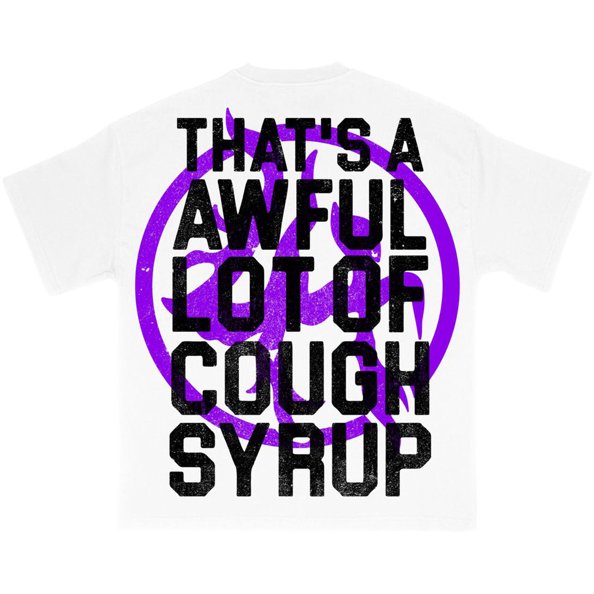 This white t-shirt made in collaboration by LOSTHILLS and That's a Awful Lot of Cough Syrup features a branded collab graphic with on front and a matching graphic on rear.