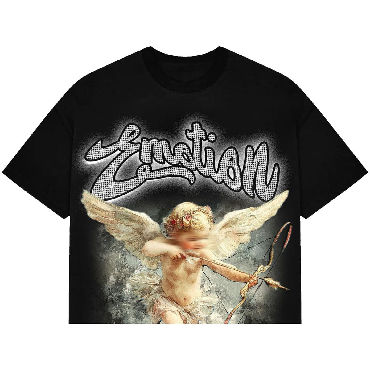 This black t-shirt from Mixed Emotion features an arrow angel graphic with branding and rhinestone details on front and a matching branded graphic on rear.