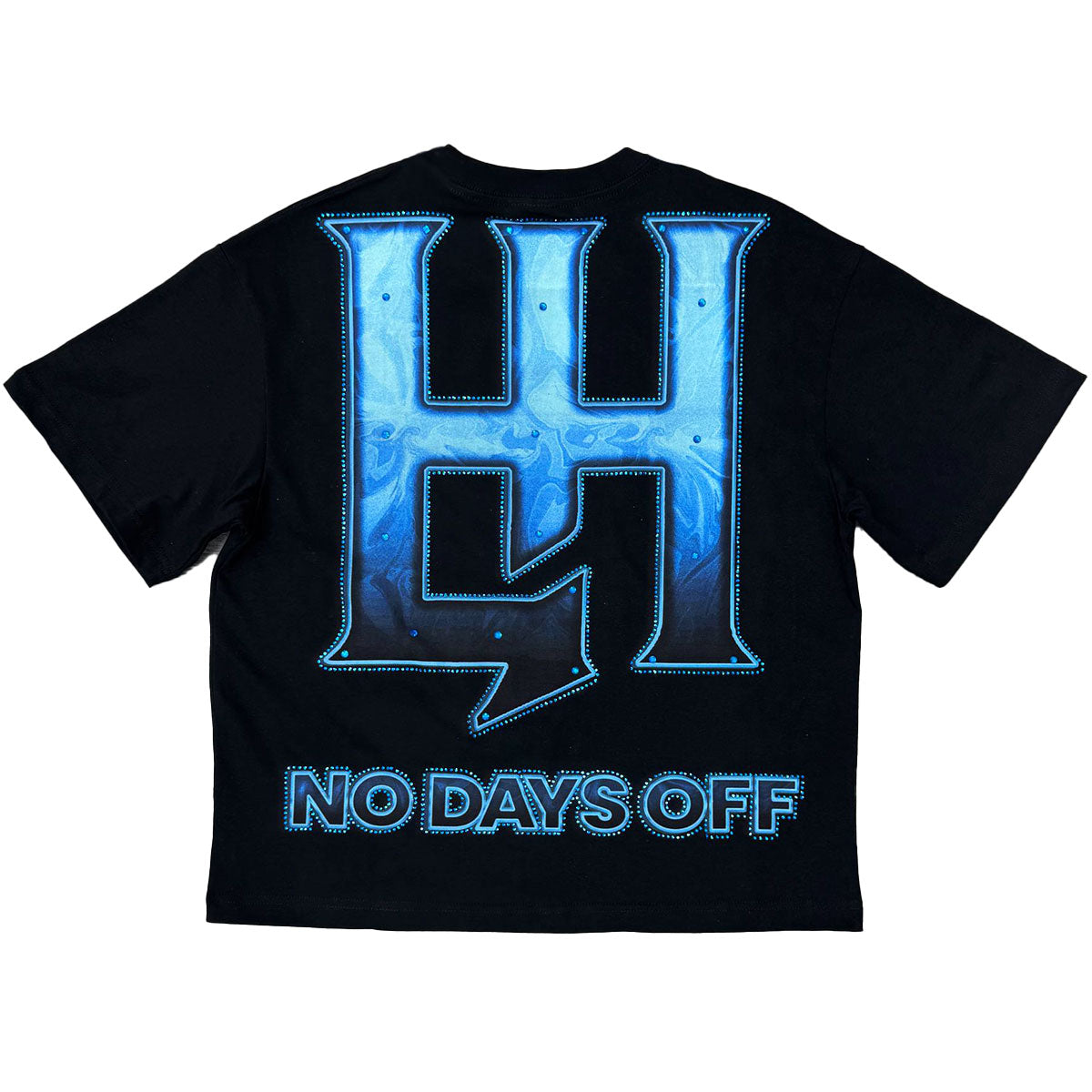 This black t-shirt from Life Hustlers features a blindfolded praying angel graphic on front with a matching monogram logo on rear with rhinestone details.