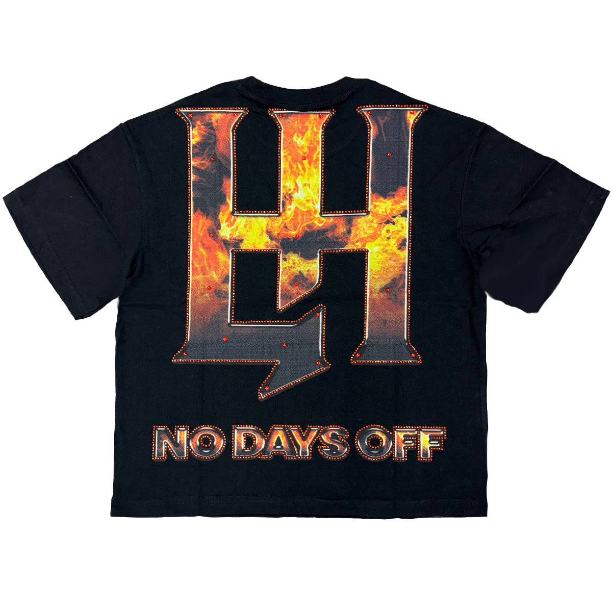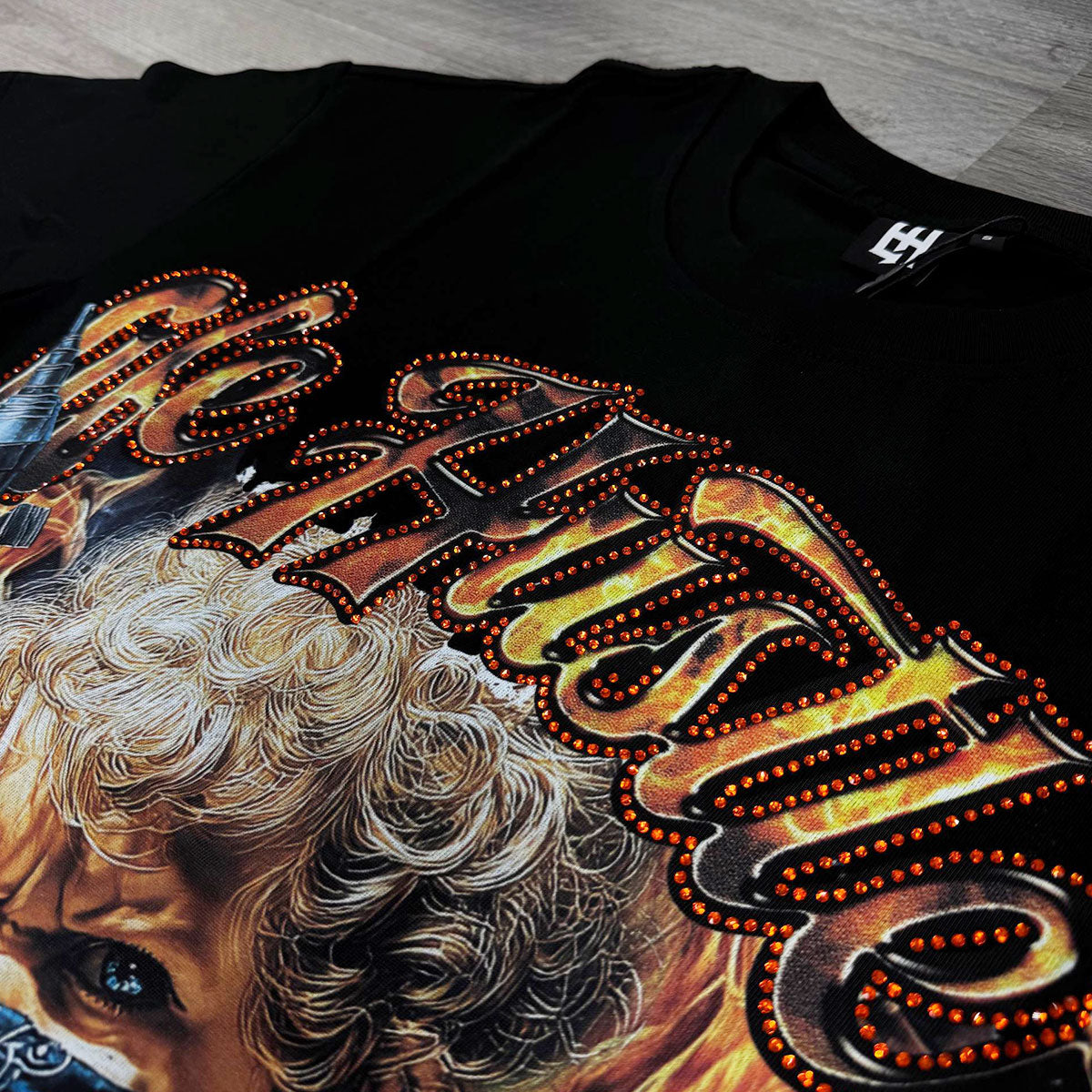 This black t-shirt from Life Hustlers features a masked AK angel graphic on front with a matching monogram logo on rear with rhinestone details on both sides.