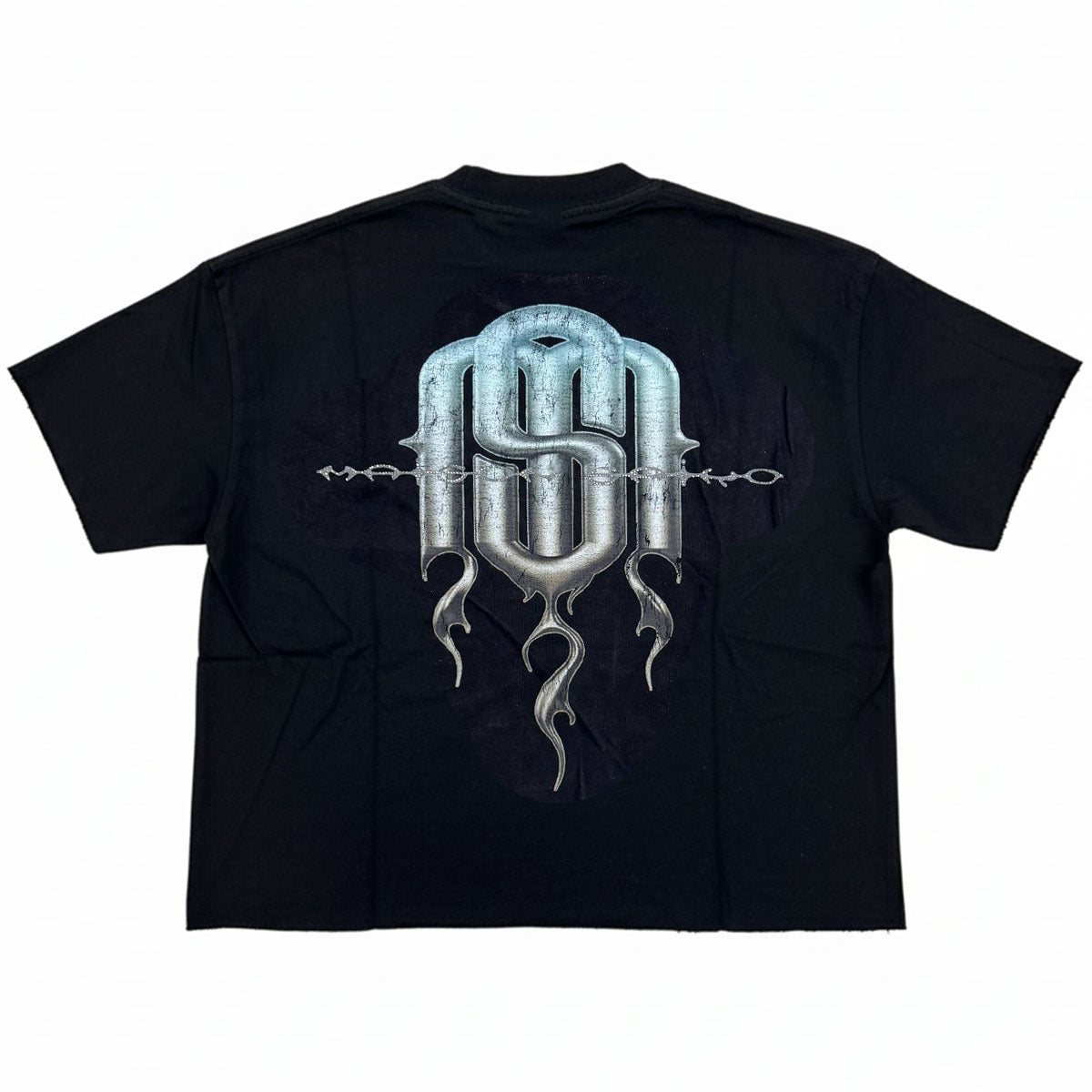 This black t-shirt from Maison Saiko features a large Cherubim portal graphic with mulitple crystal stone handmade details on front, and a large logo on back with silver rhinestone details.