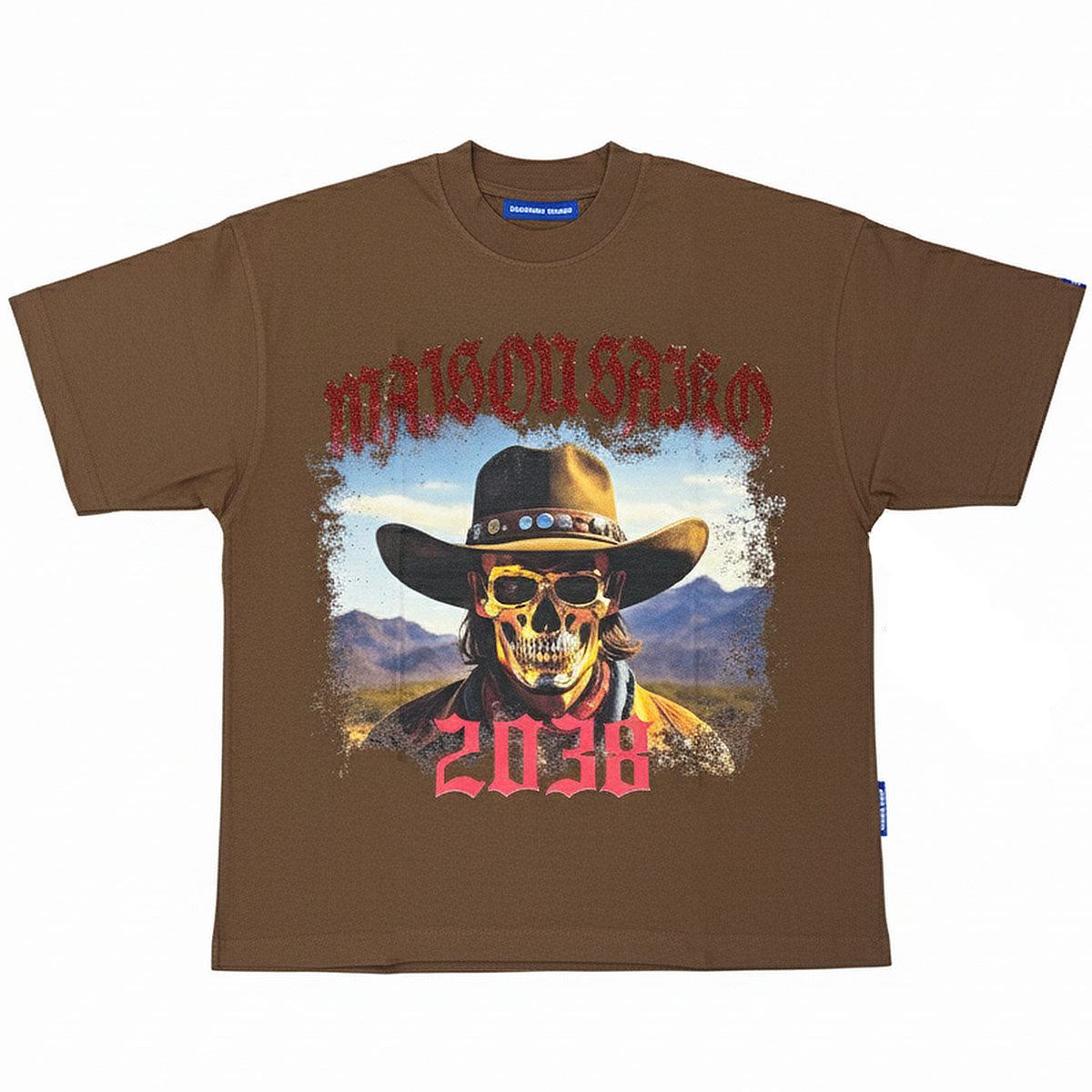 This brown t-shirt from Maison Saiko features a skull cowboy graphic with branding in rhinestones on front and a matching branded rhinestone graphic on rear.