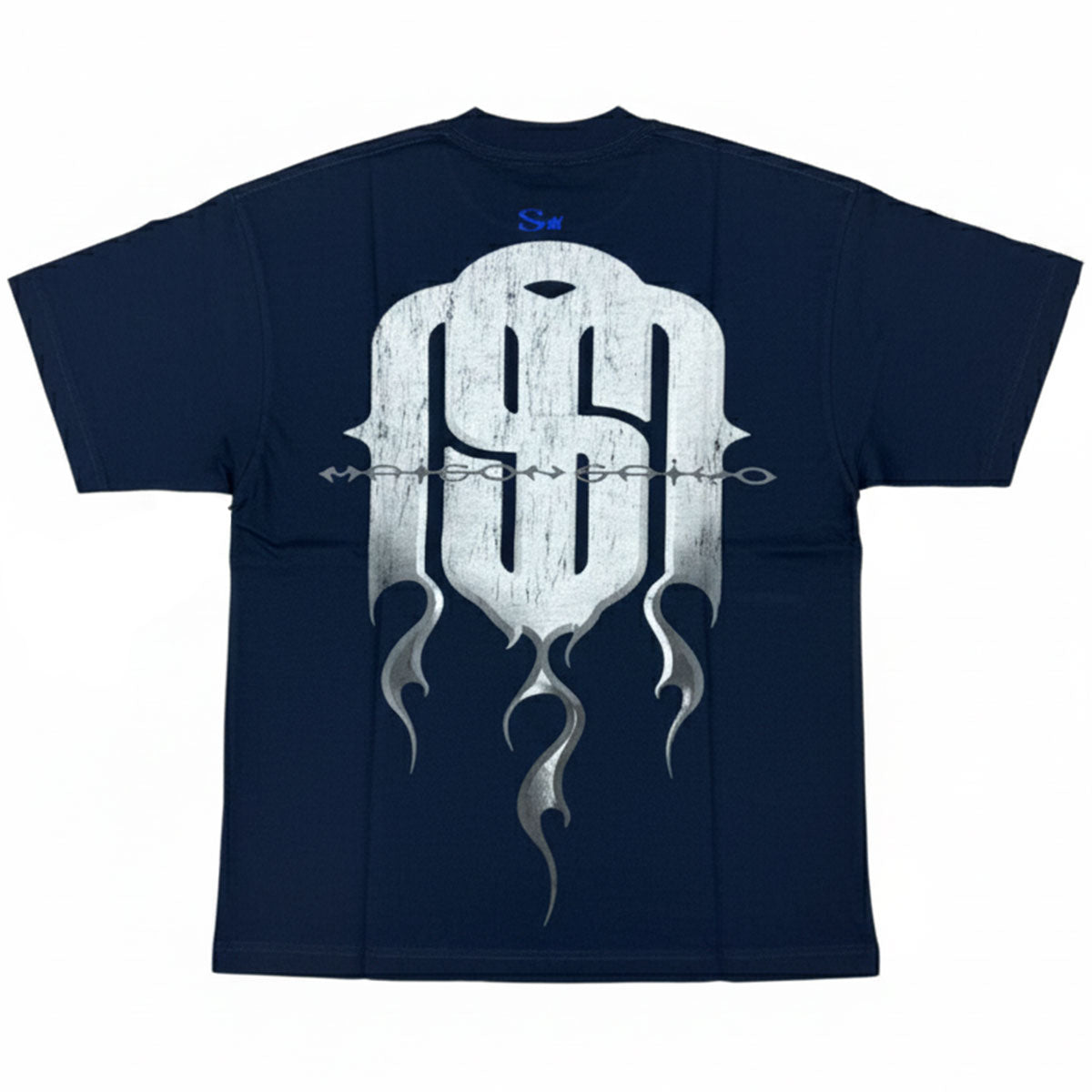 This navy t-shirt from Maison Saiko features a pharoah graphic with branding on front and a large matching branded graphic with on rear.