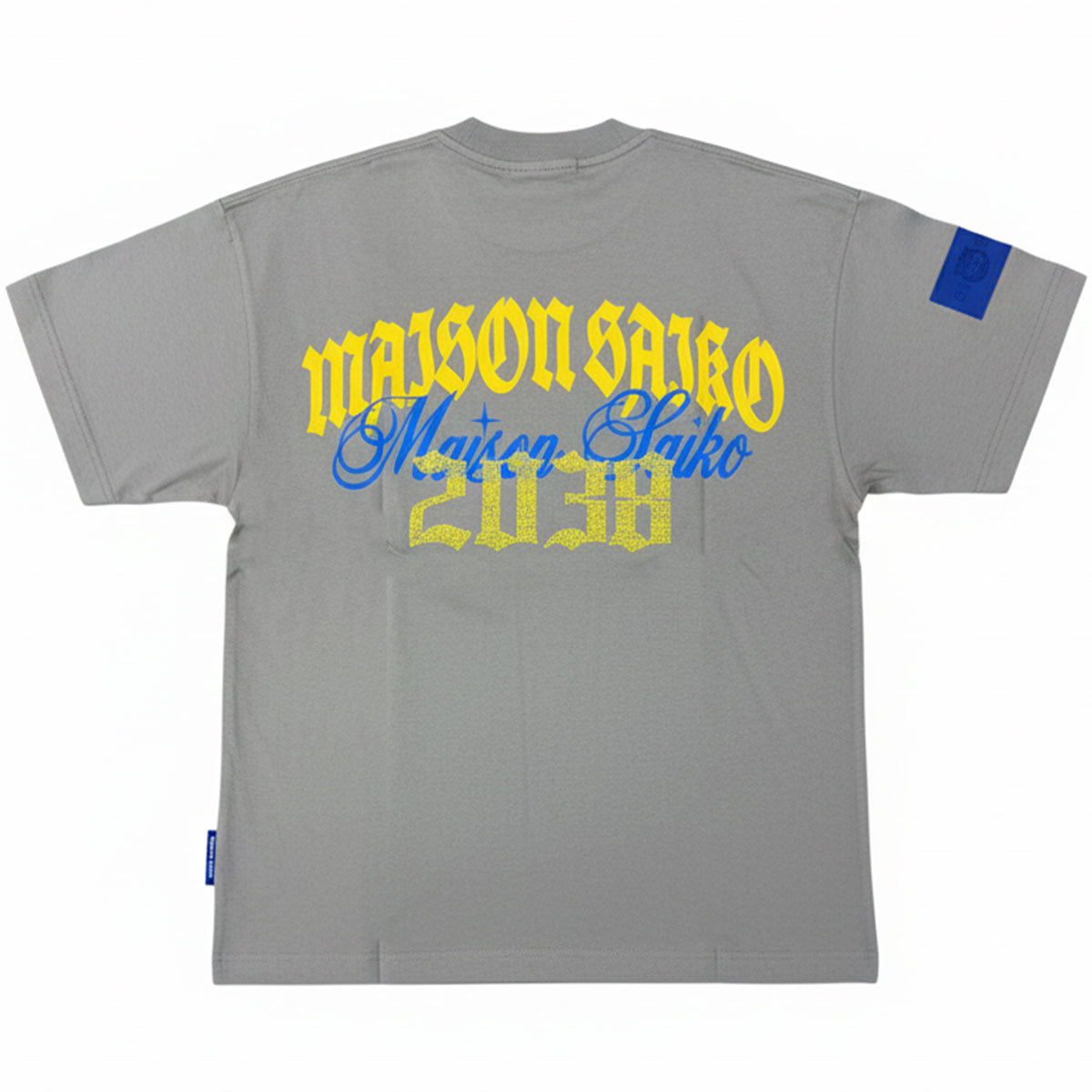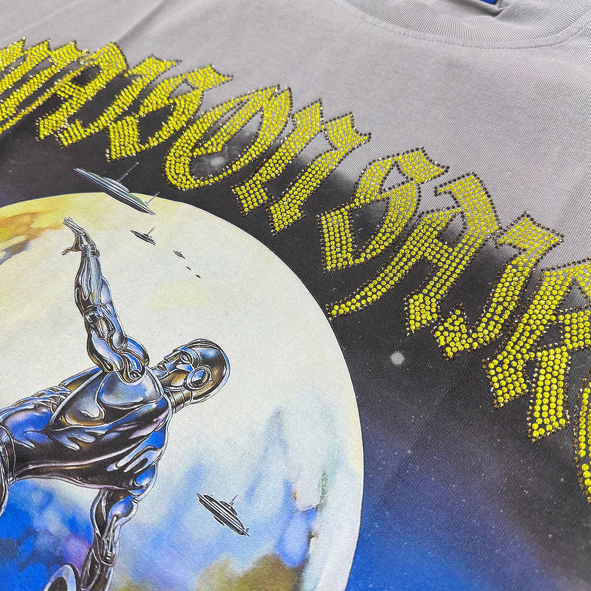 This grey t-shirt from Maison Saiko features a world atlas man graphic with branding in rhinestones on front and a large matching graphic with rhinestones on rear.