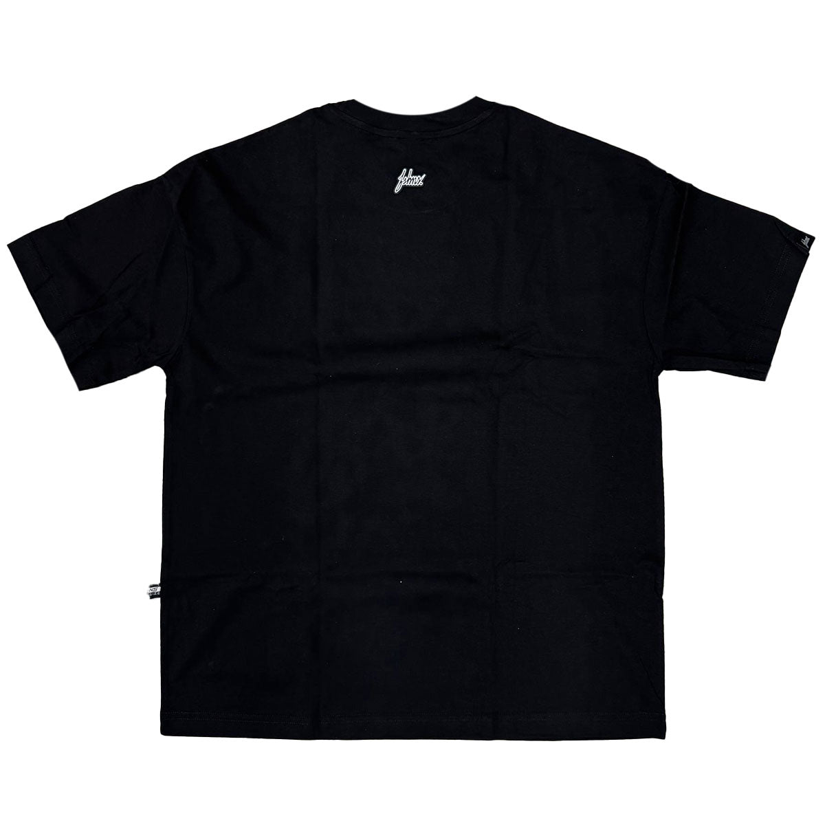 This black t-shirt from FSHNS Brand features a blue and light cream branded graphic on front and a small silicone logo patch on rear.