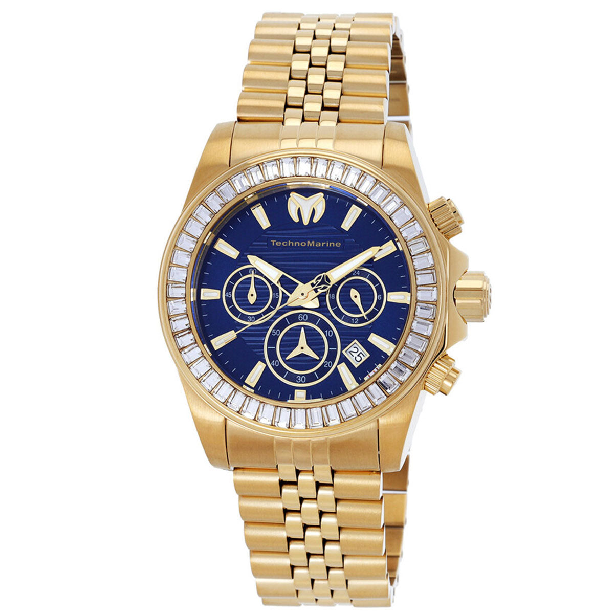 This gold-tone watch from Technomarine features a blue dial with gold-tone hands, luminescent hands and markers.
