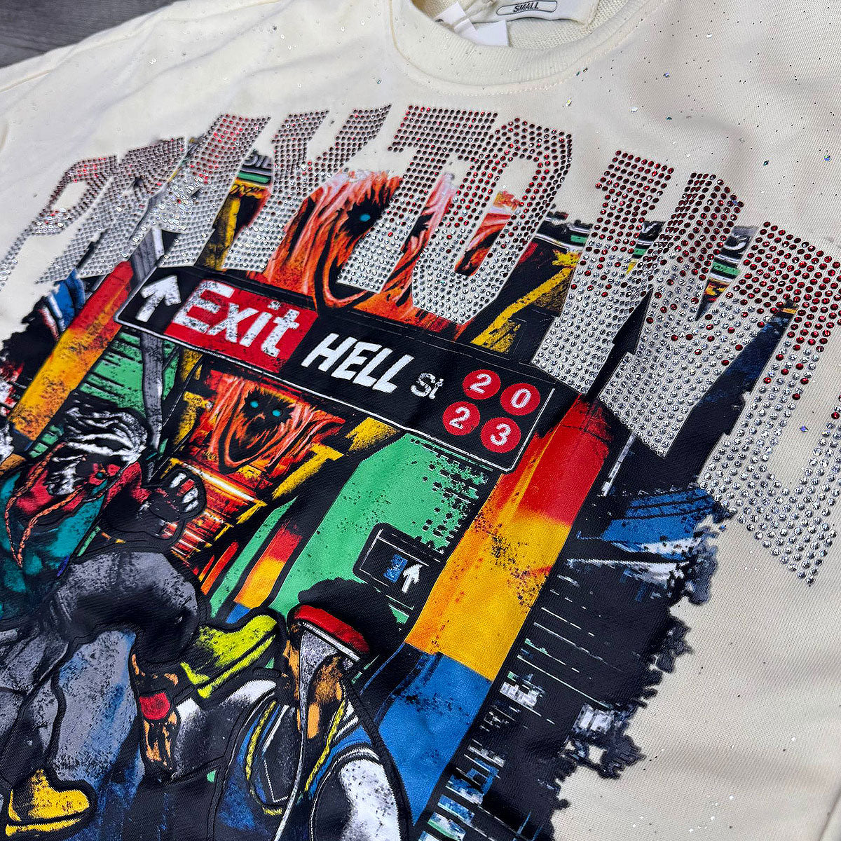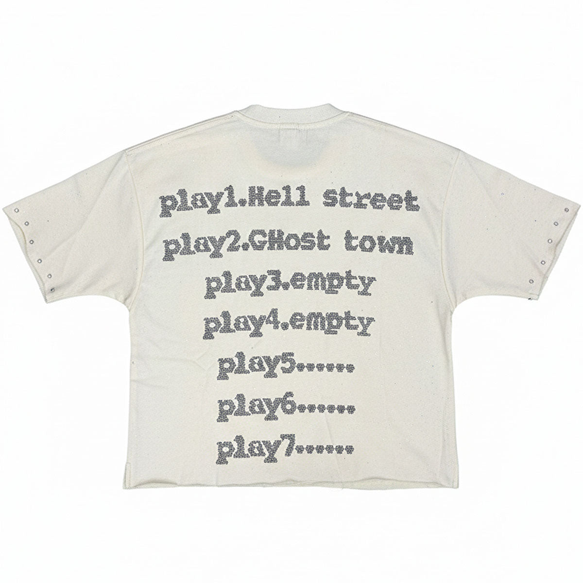 This off-white t-shirt from BKYS features a rhinestone 'Pray to Win' fighting character graphic with branding on front and a matching slogan graphic on rear.