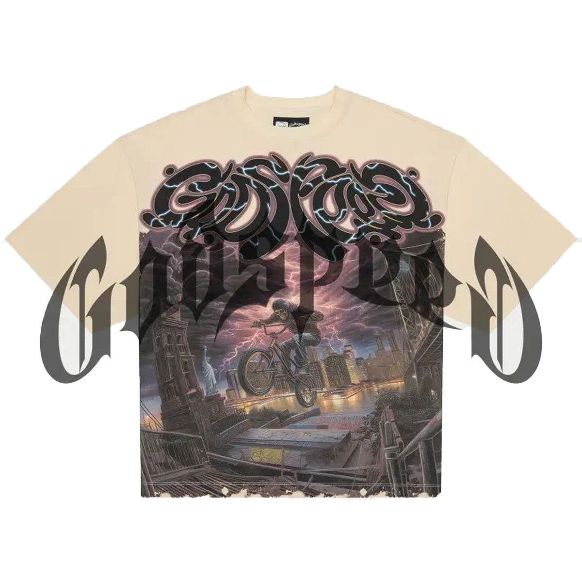 This washed & faded bone cream t-shirt from Godspeed features a flying skeleton city lightning graphic on front and a matching branded graphic on rear. BMX standing for Balance, Motion, and Expression. LIMITED TO 444 UNITS.