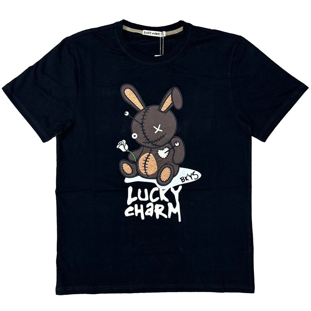 This black t-shirt from BKYS features the signature lucky charm logo patch with intricate embroidery and mocha brown details.