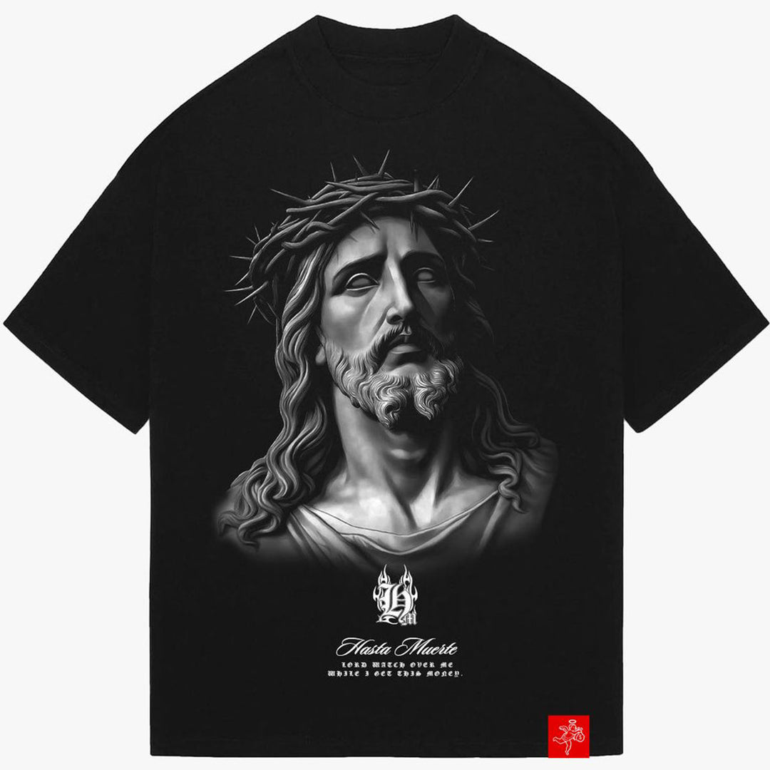 This butter cream t-shirt from Hasta Muerte Red Label features a 'Warrior of God' slogan with branding on front and a large angel soldier graphic with slogans on rear.