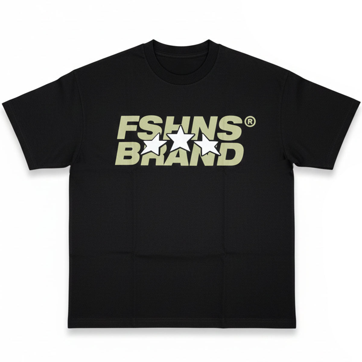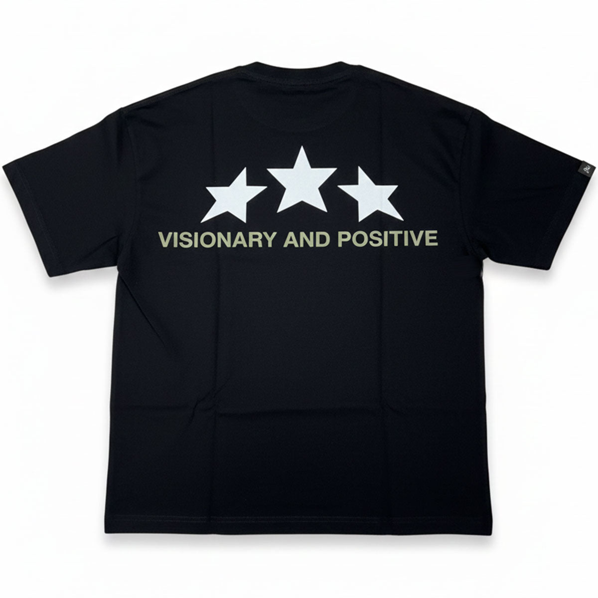 This black t-shirt from FSHNS Brand features a large reflective 3 Star graphic with an army green branded logo graphic on front and a matching reflective star graphic on rear with a 'Visionary and Positive' slogan.