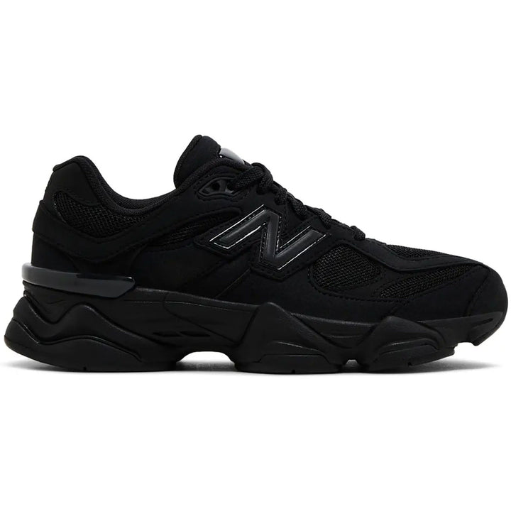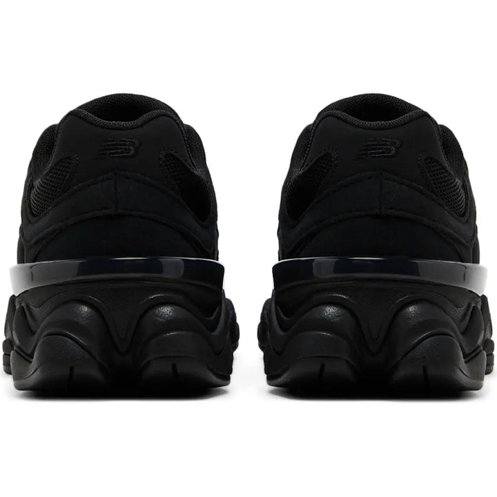 This New Balance 9060 features a triple black colorway with contrasting leather, suede, and rubber materials.