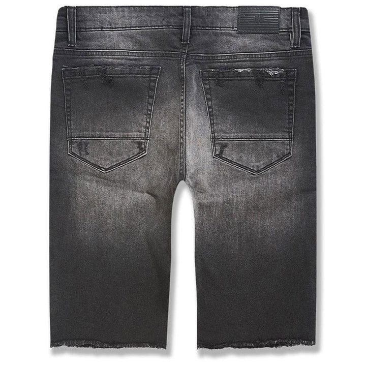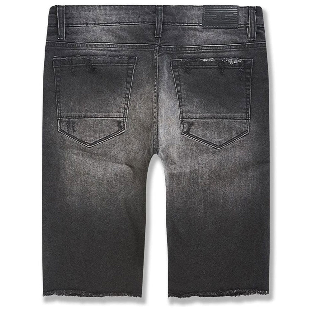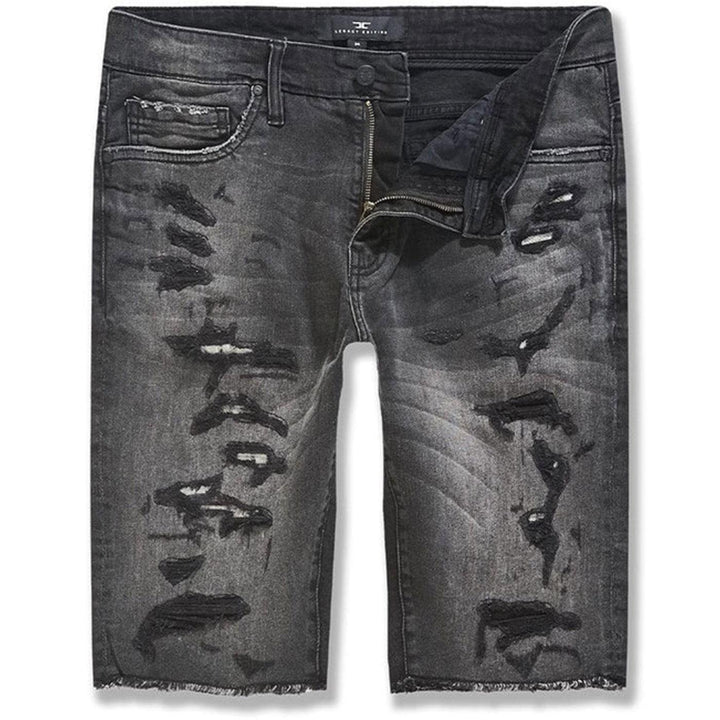 These regular rise, big men's Black Shadow denim shorts from Jordan Craig feature heavy shredding details, an 11.75" inseam for the OG look falling at knee, raw and reversed denim backing, crinkle effect, and closed inseam at knees.