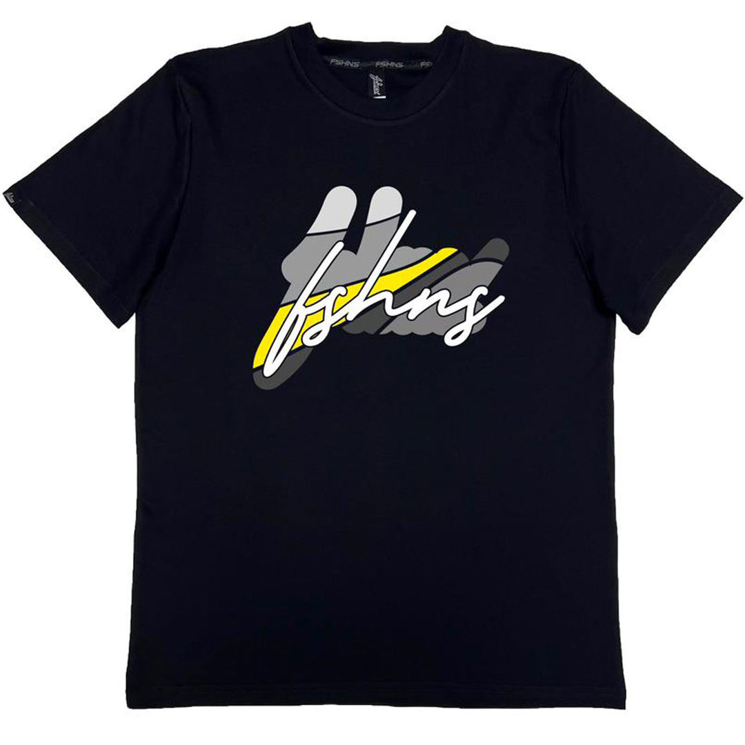 This black t-shirt from FSHNS Brand features a large mosaic style logo on front in grey and neon colors.