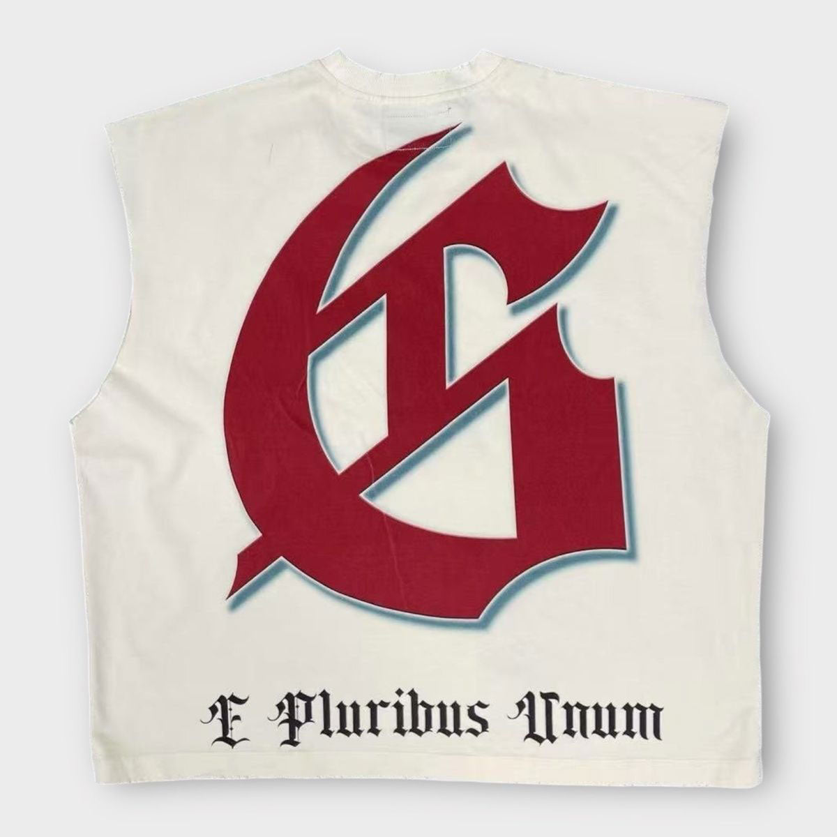 This bone cream white sleeveless t-shirt from Godspeed features a checkmate skull space graphic with branding on front and a matching G logo graphic with slogan on rear.