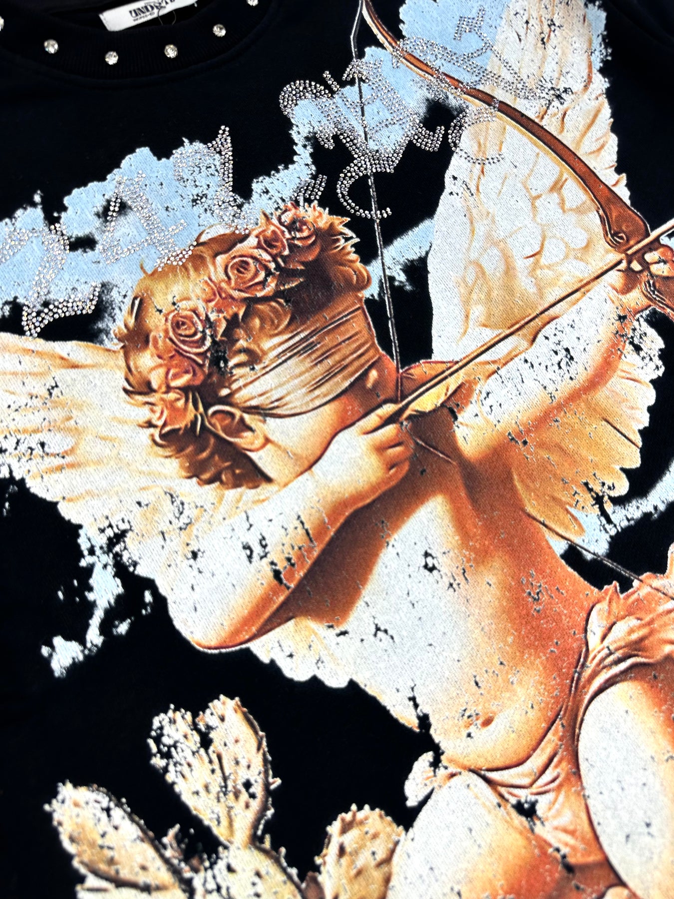 This black UNDRTD t-shirt features a detailed angel graphic on the front, highlighted with multiple rhinestone accents. Designed with a boxy fit, 3/4 sleeves, and frayed edges for a bold, elevated streetwear look.