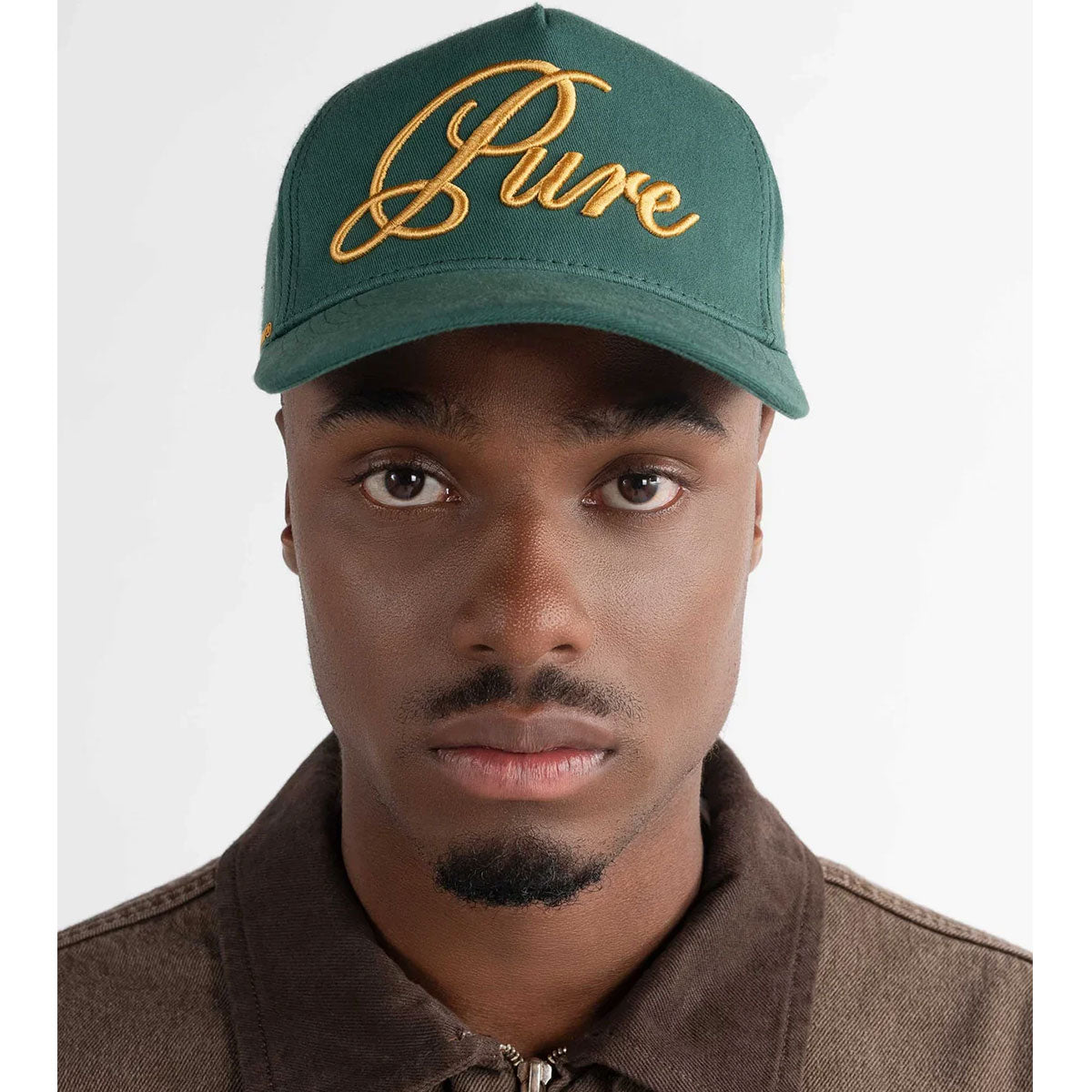 This brown hat from Pure features gold 3D brand embroidery on front and both sides.