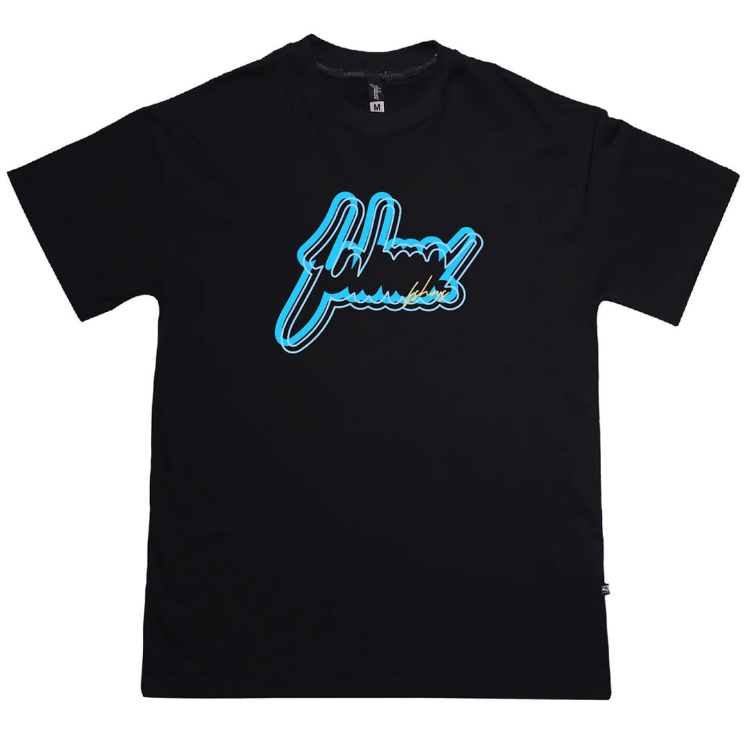 This black t-shirt from FSHNS Brand features a powder blue large branded logo graphic on front and a small rubber logo patch on rear.