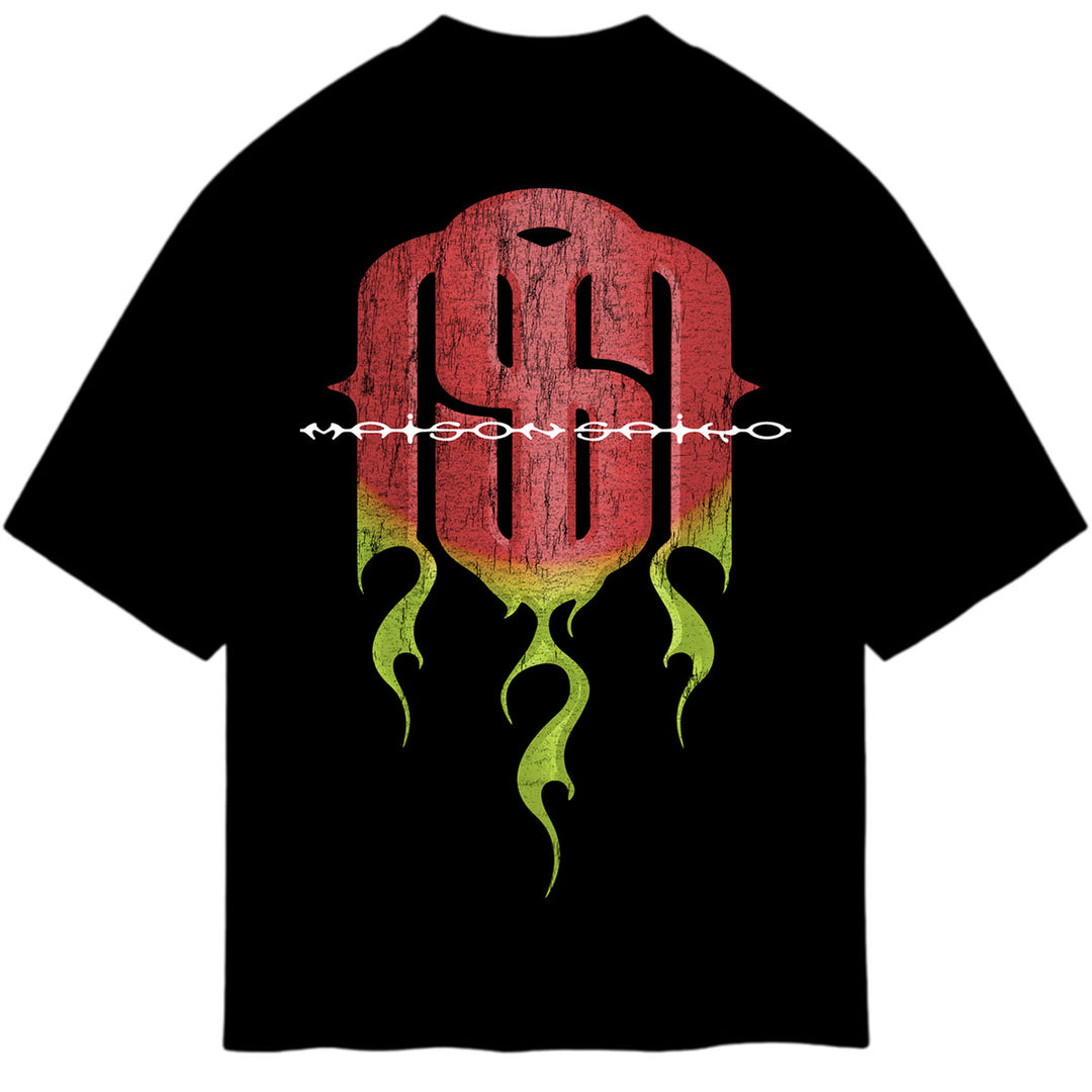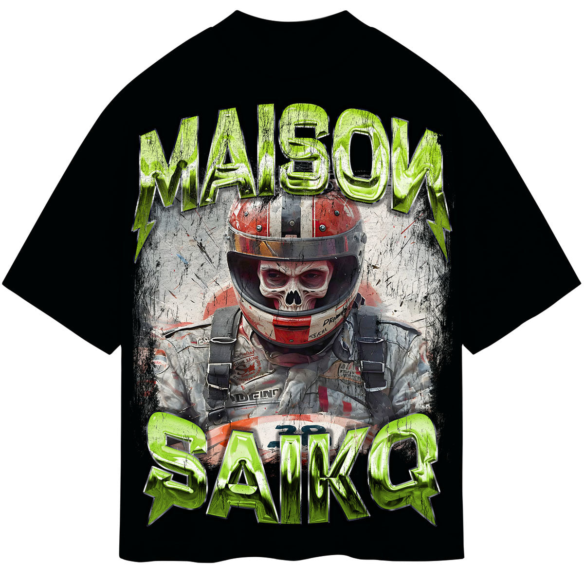 This black t-shirt from Maison Saiko features a faded skull race car driver graphic on front and a matching flaming monogram graphic on rear.