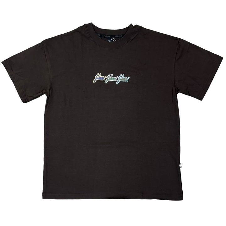 This brown oversize t-shirt from FSHNS Brand features a multiple pastel blue, pink, and green tone triple branded logo grill graphic on front and rear with a rear logo rubber patch.