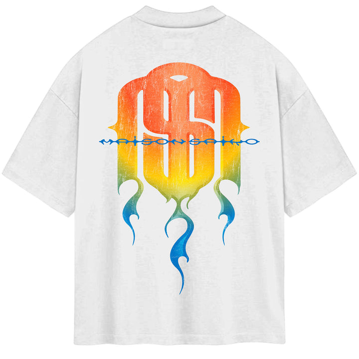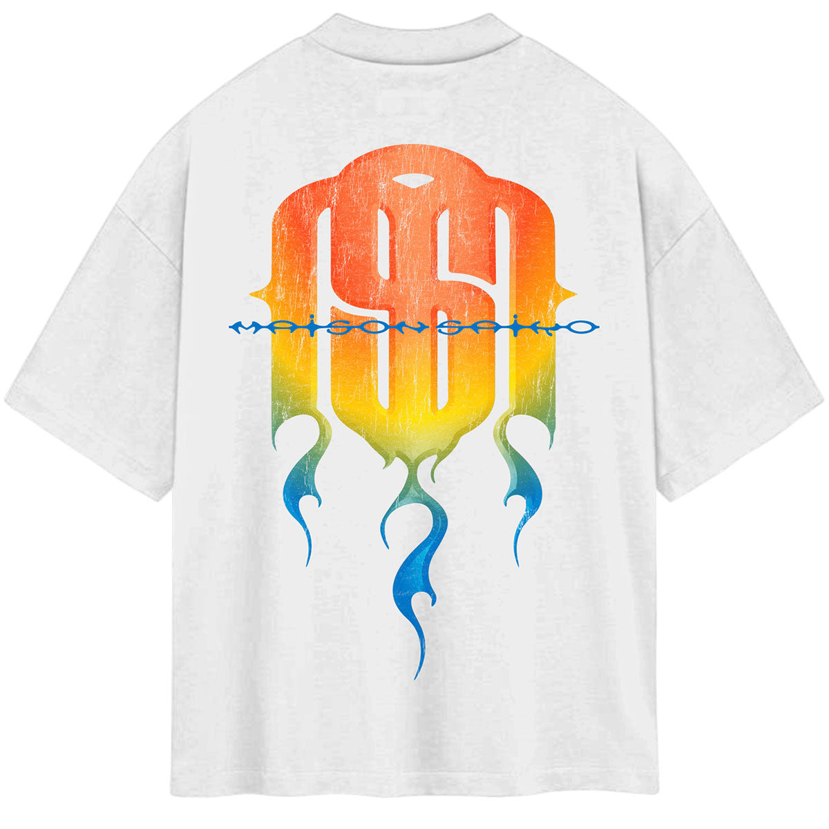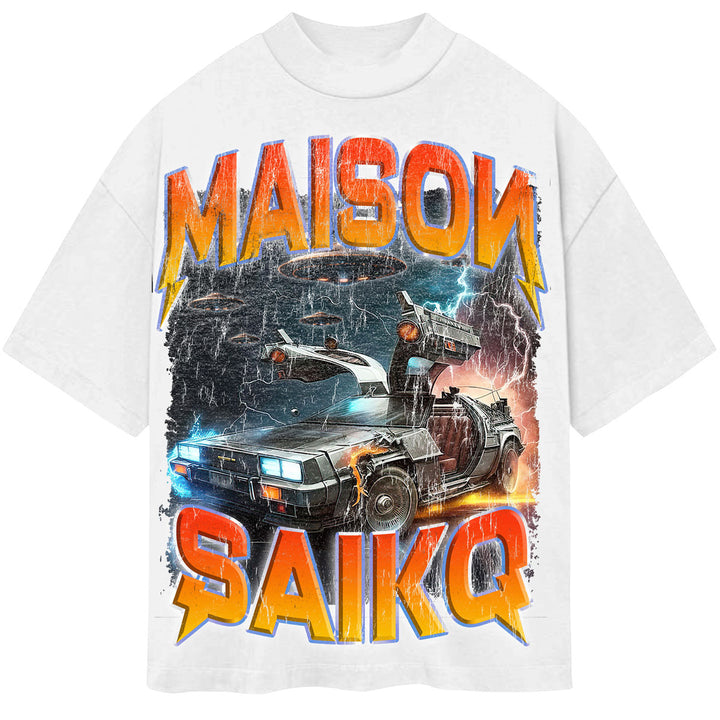 This white t-shirt from Maison Saiko features a faded Back to The Future inspired graphic with branding on front and a matching flaming monogram graphic on rear.
