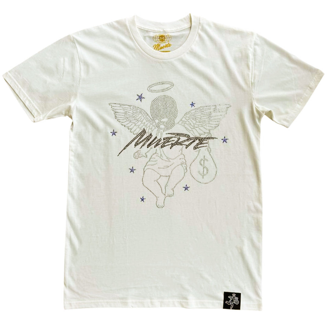 This natural white t-shirt from Hasta Muerte features a dotted rhinestone ski mask angel graphic with branding on front.