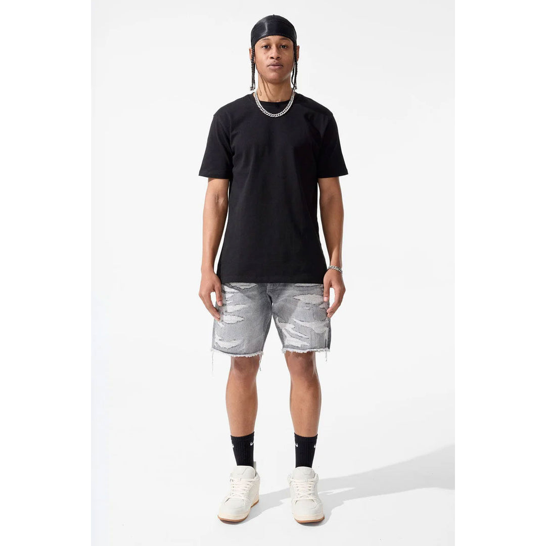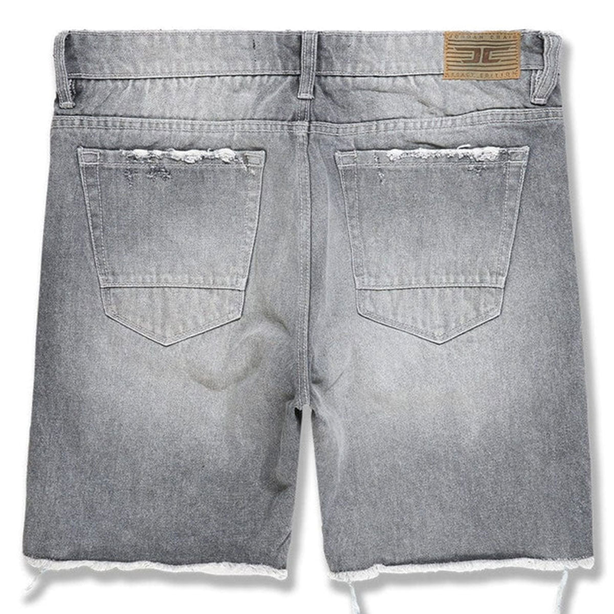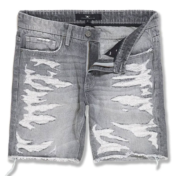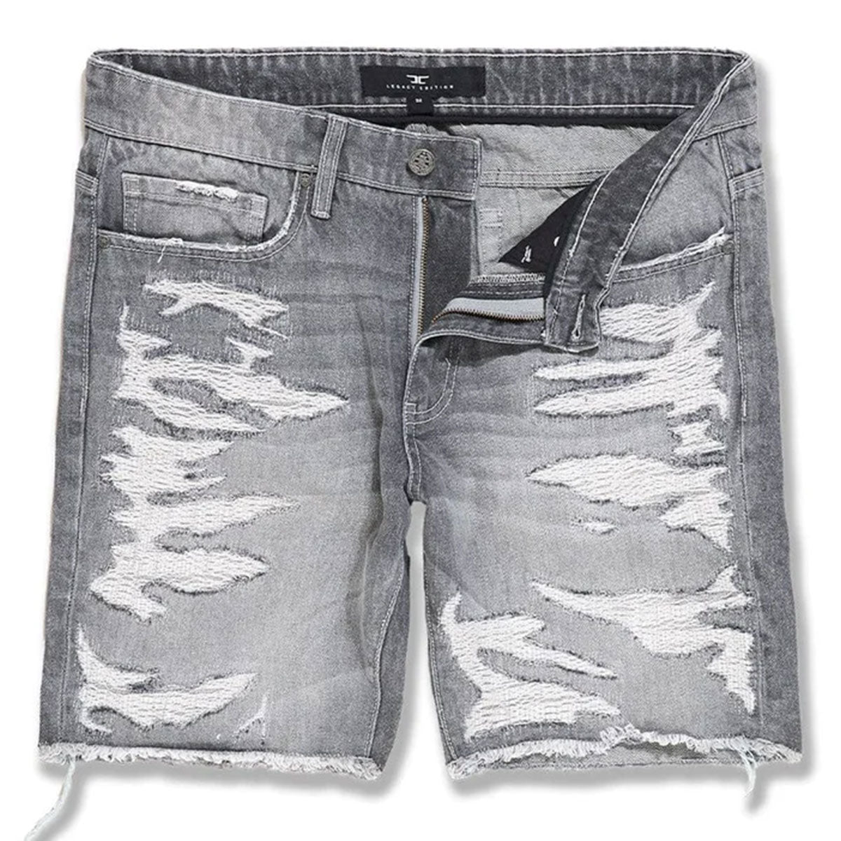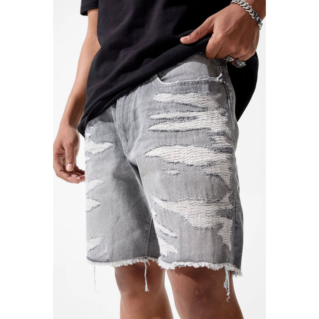 These regular rise, cement wash denim shorts feature 3D whiskers, open bottom hem with hanging weft, and a rip & repair design with self fabric backing,