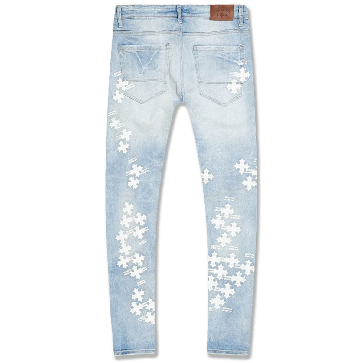 These regular rise, light blue jeans from Jordan Craig feature tight tapering from knee to ankle, looser fit from waist to thigh, a custom metal hang-tag, an all-over 'See You in Paradise' stamp print, rip & repair design with fused shreds, and unique distresses.